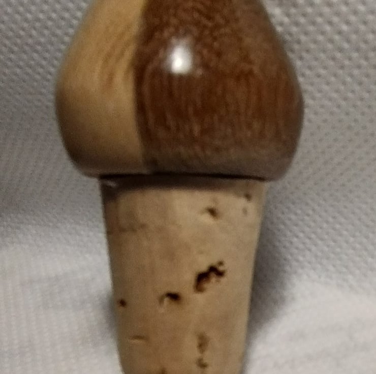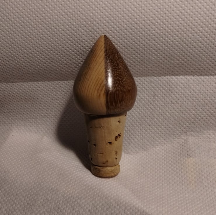 Years ago I glued a recycled piece of teak to a piece of pine, then turned it into a cone shape....finally last week I made it into a wine stopper, using an "axminster cork"/ Its been sealed with "chestnut acrylic sanding sealer" and the top has been polished with cannula wax...the cork has been left natural....