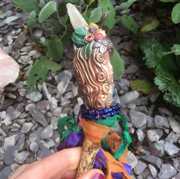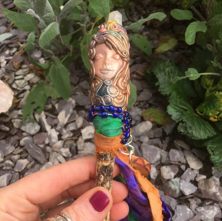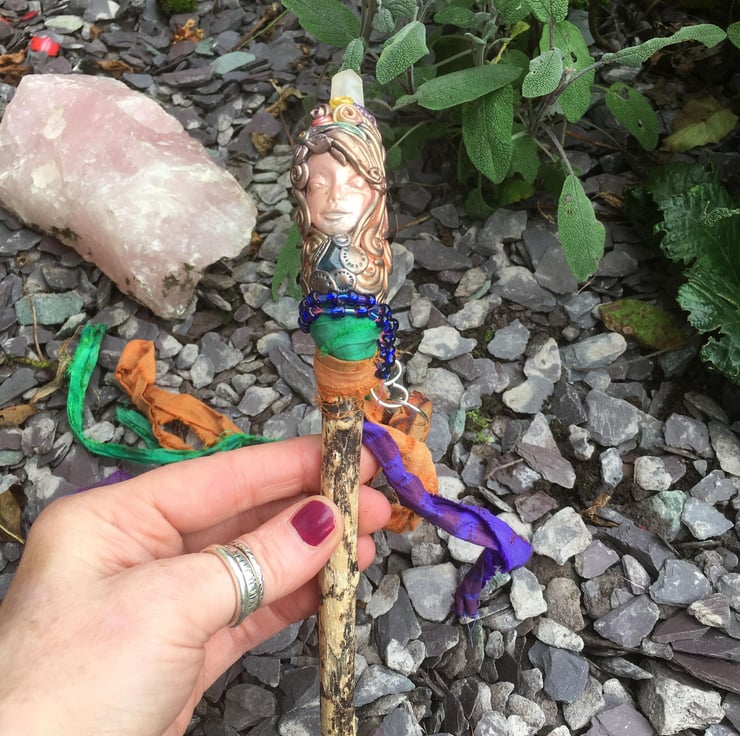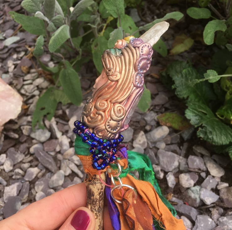 The Driftwood Quartz Wand is a truly enchanting and handmade piece that brings a touch of magic to any sacred space. Crafted with meticulous attention to detail, this exquisite wand features a beautifully carved goddess sculpture and a stunning quartz crystal. It is perfect for those seeking to harness the power of natural materials and connect with the energies of the Earth. Whether used for rituals, meditation, or as a decorative centrepiece, the Driftwood Quartz Wand is a symbol of beauty, spirituality, and the power of nature's elements.