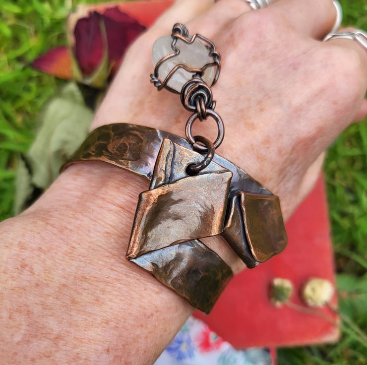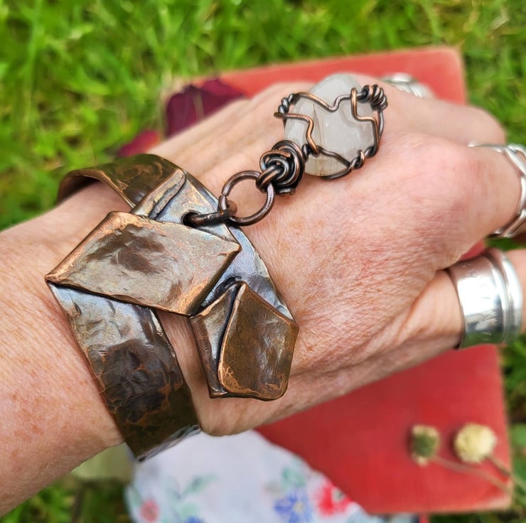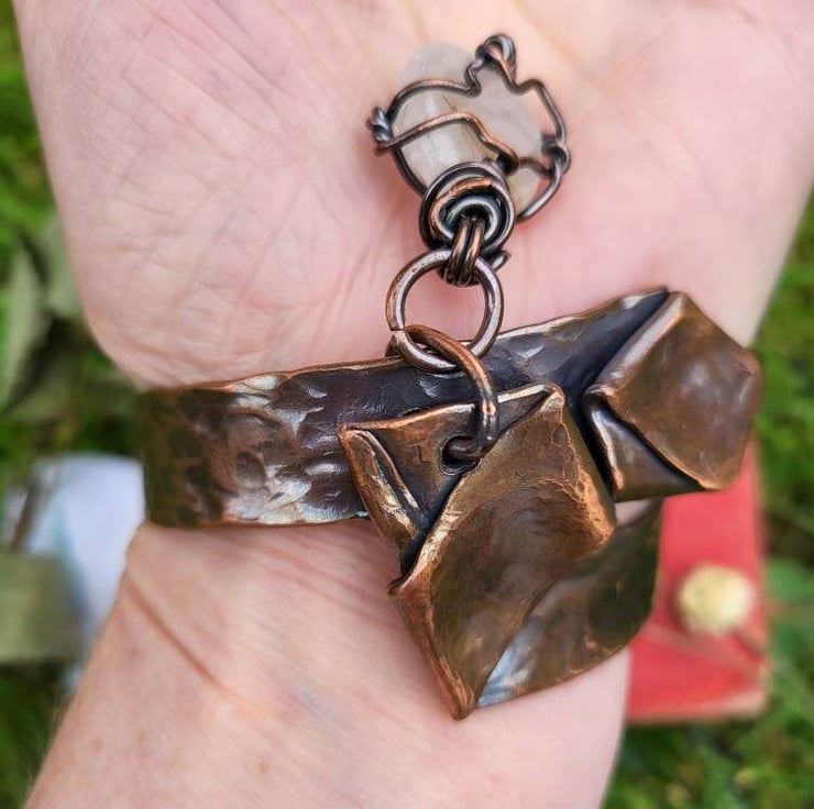 My handmade chunky copper bangle with rutilated quartz crystal charm is a unique piece that adds a rustic bohemian touch to any outfit. Each piece is carefully crafted with love and creativity, making it one-of-a-kind and special. The fusion of copper and rutilated quartz crystal creates a beautiful contrast that stands out and creates a wonderful hippie vibe. This bangle is versatile and perfect for both casual and formal occasions, adding a touch of personality to any outfit.
