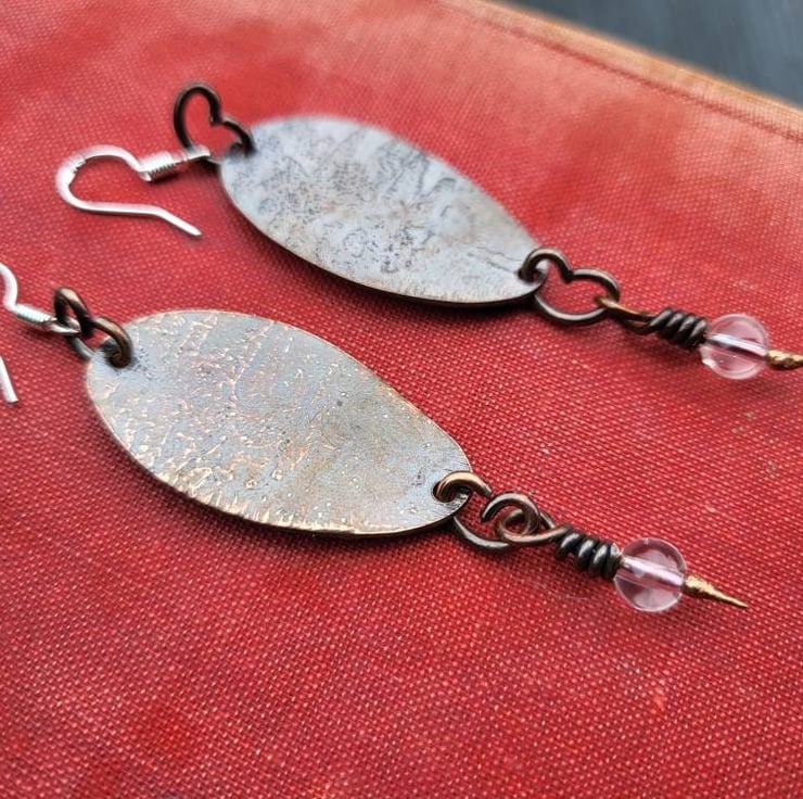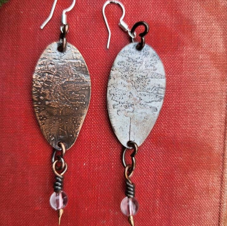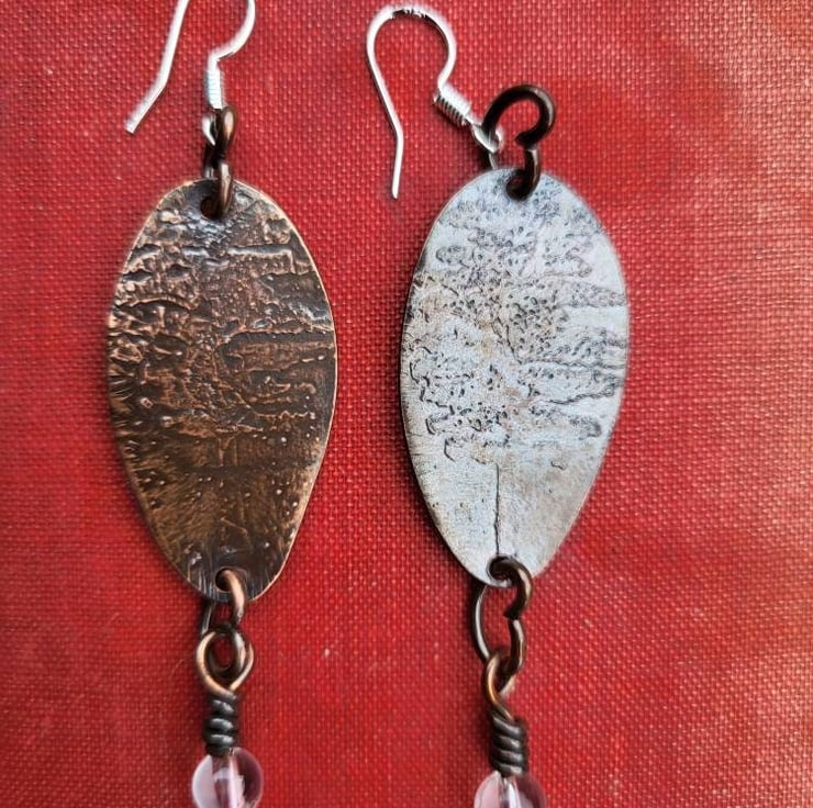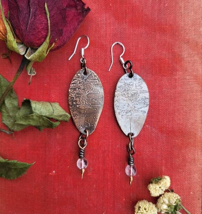 These handmade oxidized etched copper tree earrings with a quartz sphere are the perfect addition to any outfit. With their unique design and rustic colouring, they are sure to be noticed and complimented. These earrings have a bohemian touch that adds a feminine charm to any look. They are truly one-of-a-kind and will make you feel like a goddess when you wear them. Not only are they a perfect gift for yourself, but they are also an ideal present for the special goddess in your life.
