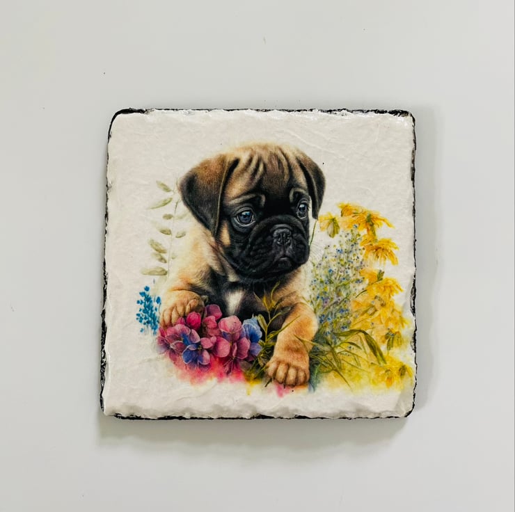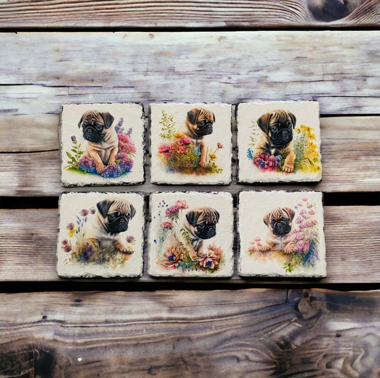 Square slate coasters featuring cute Pug puppies. Each coaster, measuring 10x10 cm (4"), is handcrafted and decoupaged with adorable images of Pug puppies. They are finished with a heat-resistant varnish for added durability. The reverse side is painted black and equipped with foam feet to protect your surfaces.