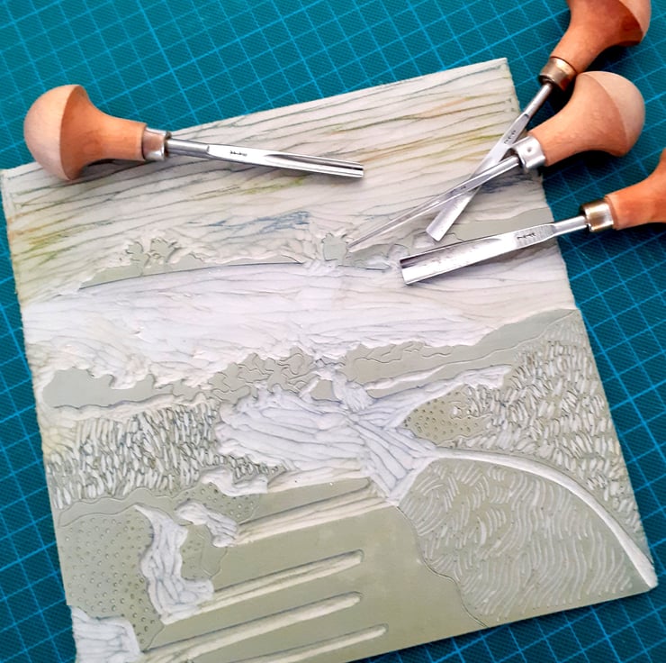 This original linocut print shows a road with slanting shadows and textured patterns of grasses and shrubs on either side. The road leads to a hedgerow and beyond are bright green fields and a path that leads to a treeline. In the distance is a hazy blue sea that blends into the sky. The white shapes of wind turbines can be seen on the horizon.