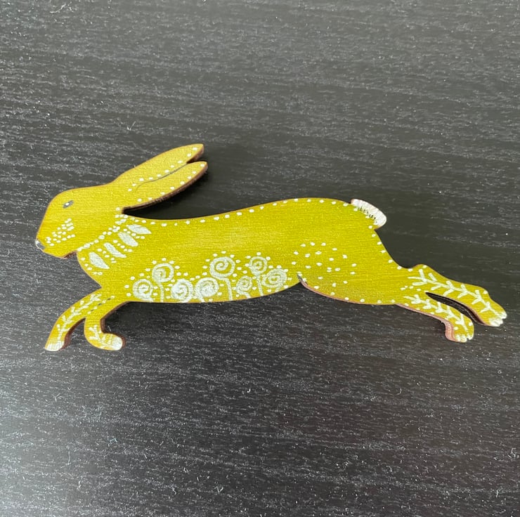 The Hare is a pale lime green with white decoration, it has a very strong magnet attached to the back please see photos.