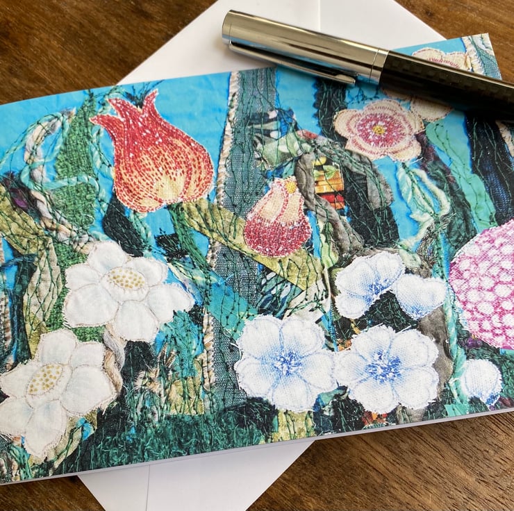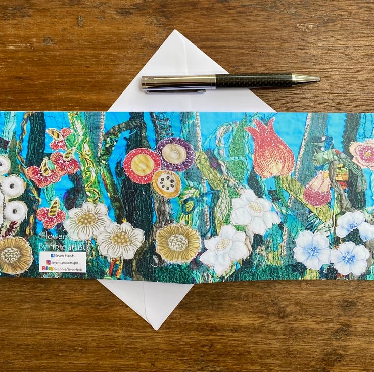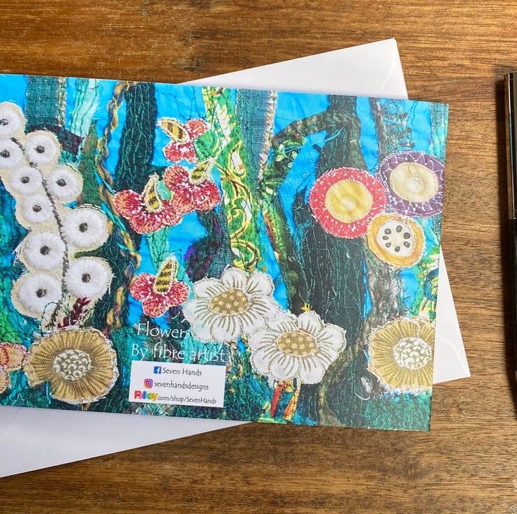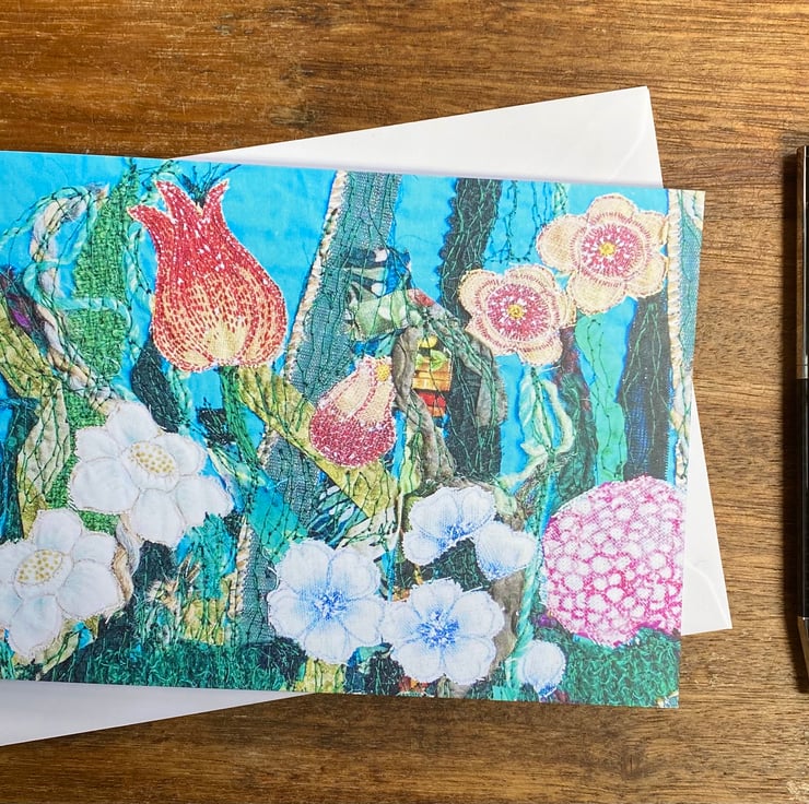 This card is a print of one of my felted pieces with free motion embroidery. This one shows a the Dawn rising behind a hill with a tree silhouette. It’s ideal for any occasion. The card measures 12.5 x 18cm and it comes with a white envelop in a plastic cover for protection.