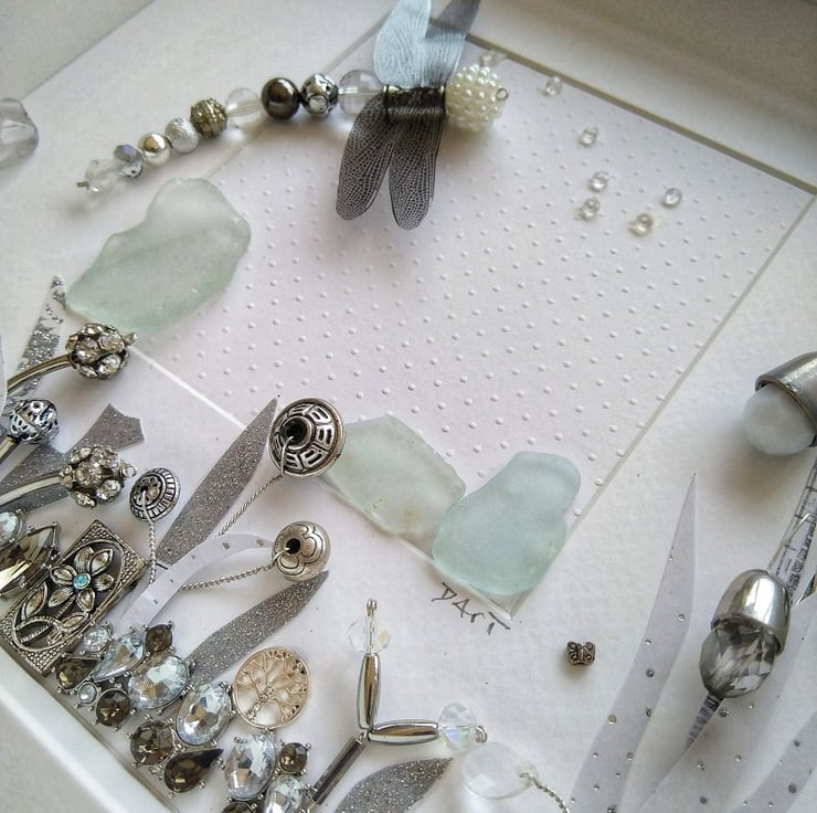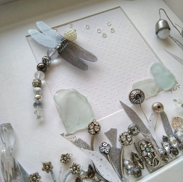 All sorts of upcycled beads make up the flower garden and foliage has been cut from used greeting cards. A dragonfly flies above and there's a representation of the constellation 'The Plough' picked out in acrylic crystals against a snowy sky.