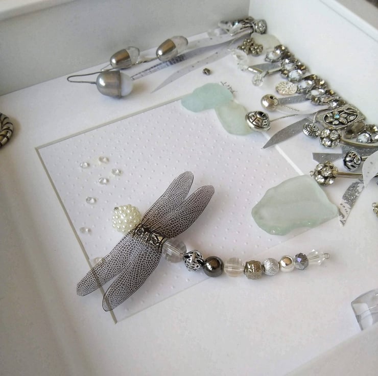 Hello and welcome! This page is home to Beaded Beasties: mixed media box frames of dragonflies and other creatures within an environment. Each one unique, made from new and recycled materials. I hope you love what you see.