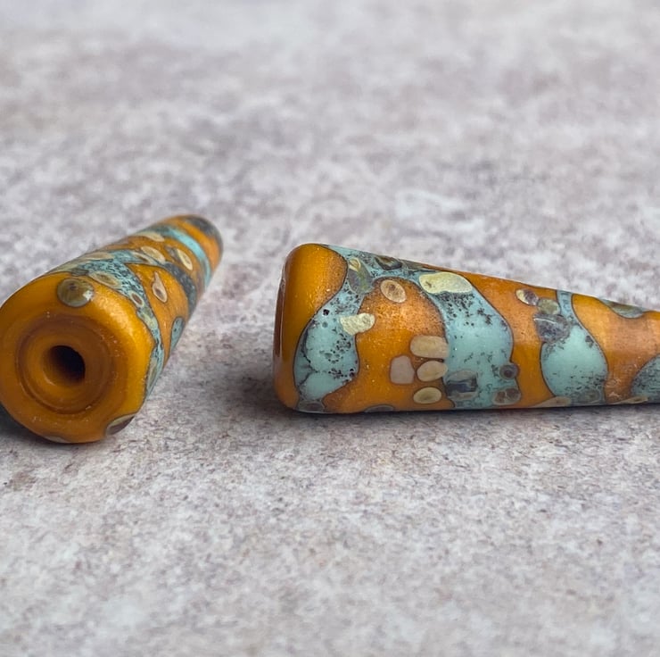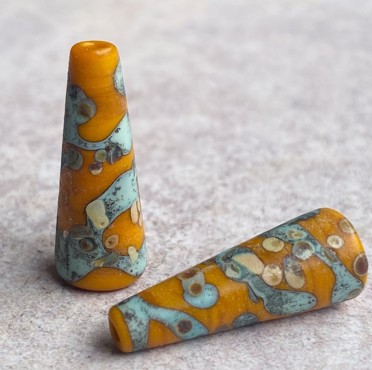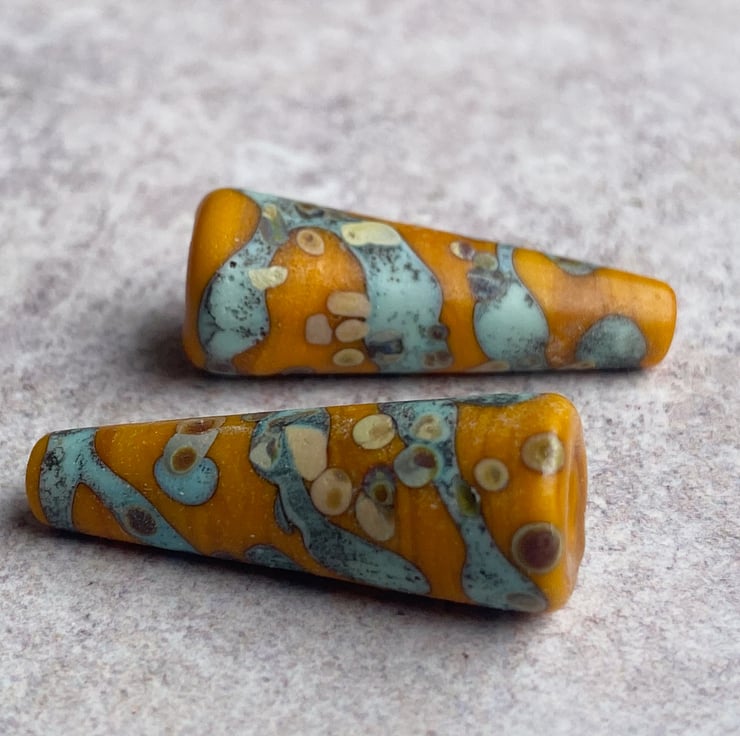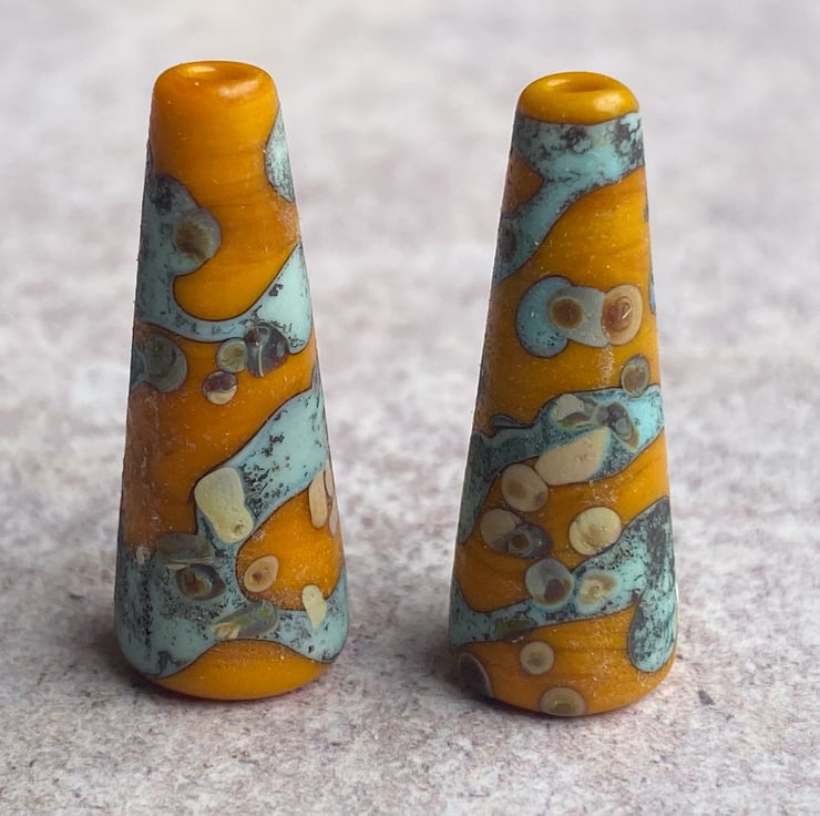 A pair of small lampwork cone beads. Opaque ochre and copper green decorated with raku frit and treated in the flame for a rustic finish.