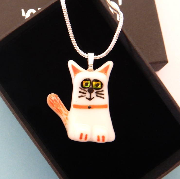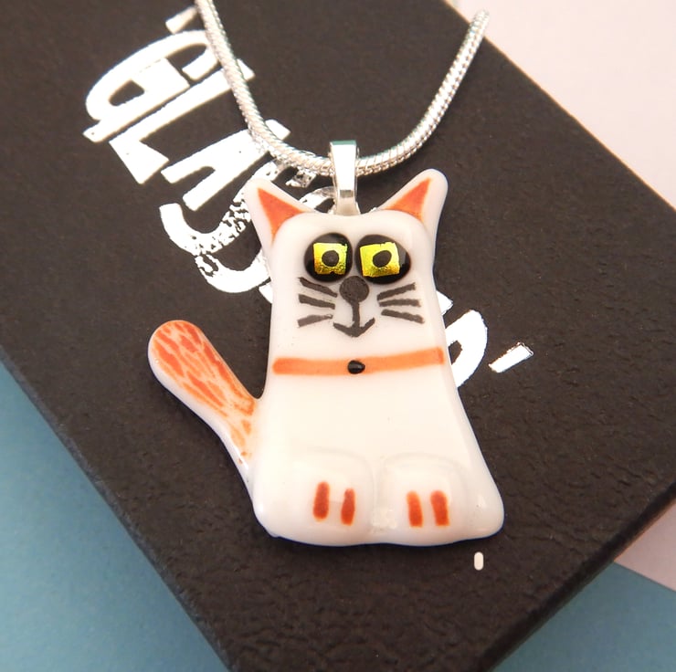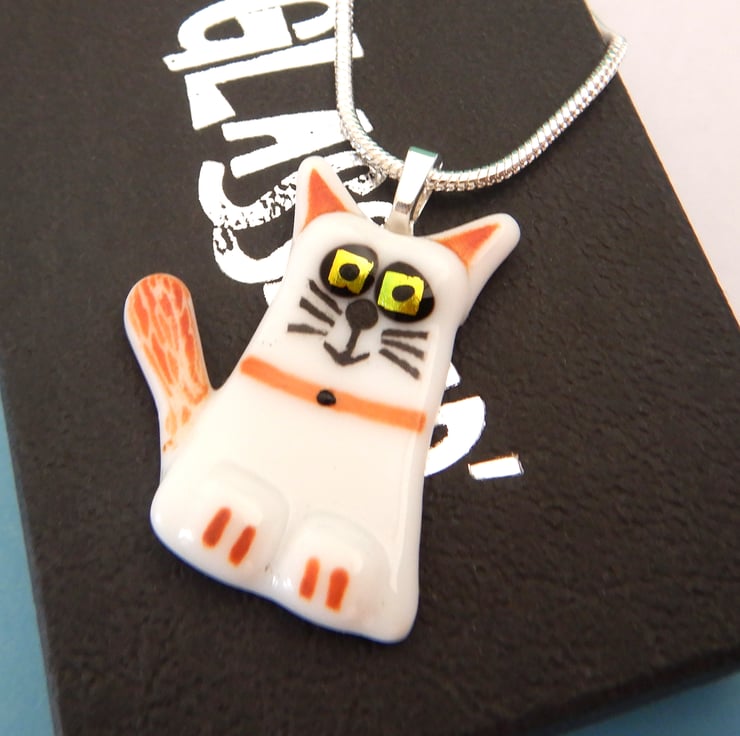 It started off as a white bulls-eye glass backing which I then carefully cut and ground into the cat shape. The details were added using 'glassline (powdered glass). The cat was carefully painted on using a very fine brush and the eyes were made from cut sections of dichroic glass.
