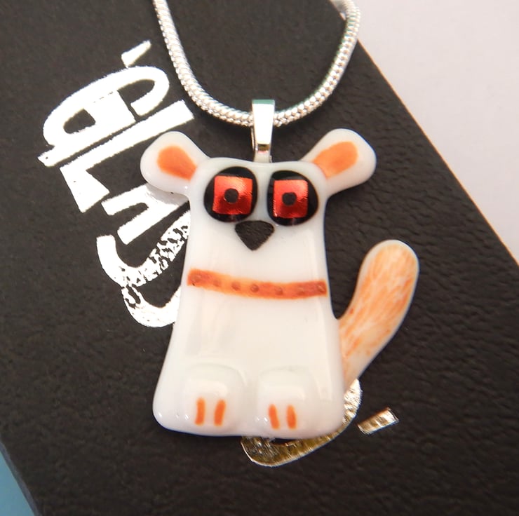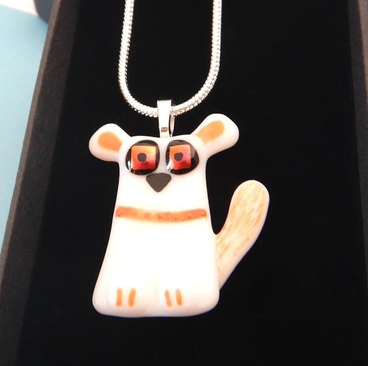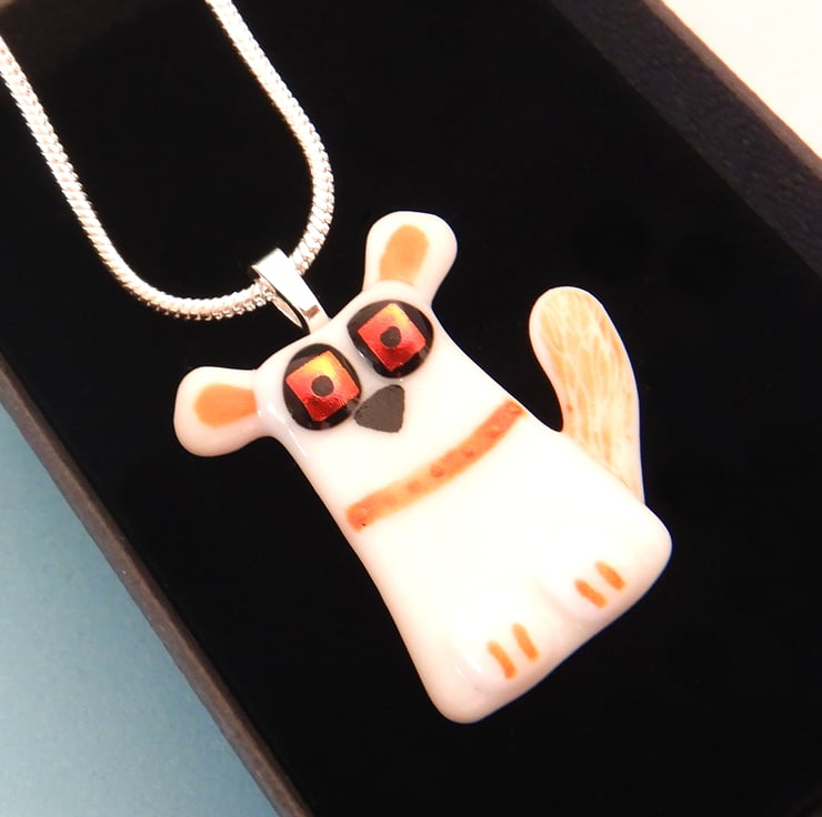 It started off as a white bulls-eye glass backing which I then carefully cut and ground into the dog shape. The details were added using 'glassline (powdered glass). The dog was carefully painted on, using a very fine brush and the eyes were made from cut sections of dichroic glass.