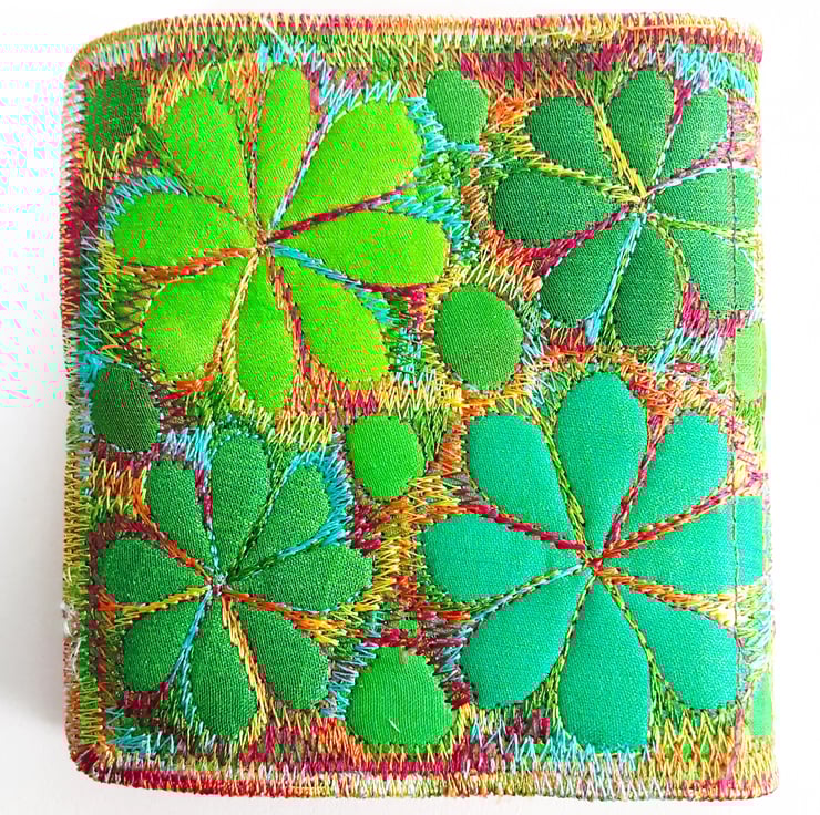 Made from layers of fabric including hand dyed Egyptian cotton and silk fabrics using the free machine embroidery style of sewing