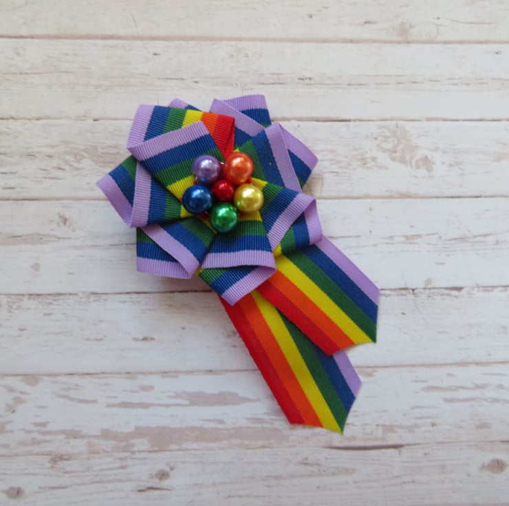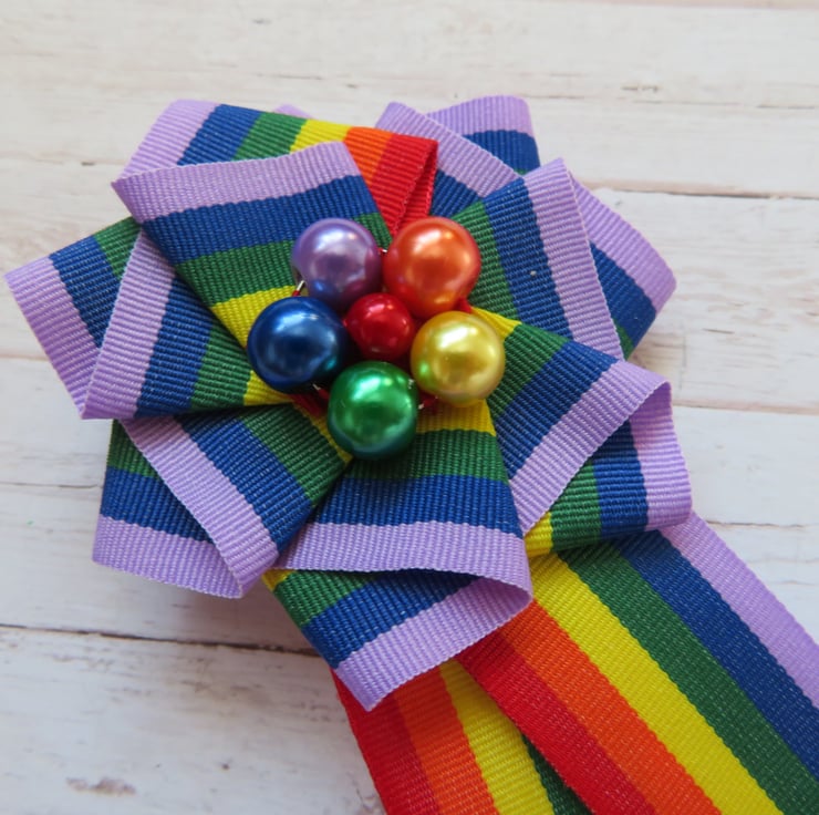 Made with a small circle of royal blue felt with a small brooch pin attached and a handmade and sewn ruffle of Rainbow Pride soft grosgrain ribbon with wide shaped trails and finished with a cluster of one of each colour of the rainbow coloured pearl.