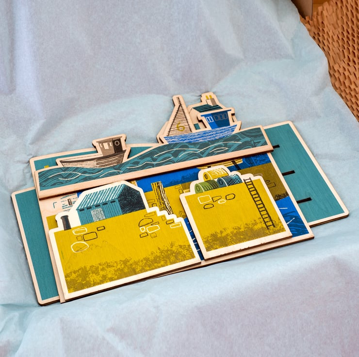 This Wooden Harbour scene is made from 4mm poplar plywood and is completely hand printed by John in five colours. It is based on all the harbours we have visited but it is not specifically of any one harbour.