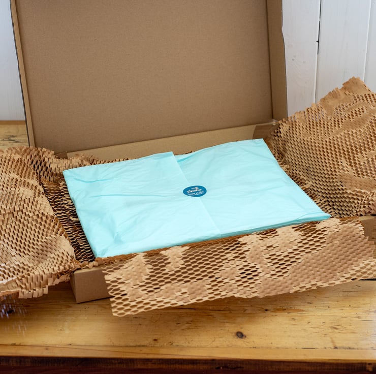 It will come flat, wrapped in tissue, expanding brown paper, in a cardboard box, and then wrapped in brown paper for postage.