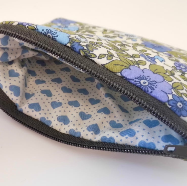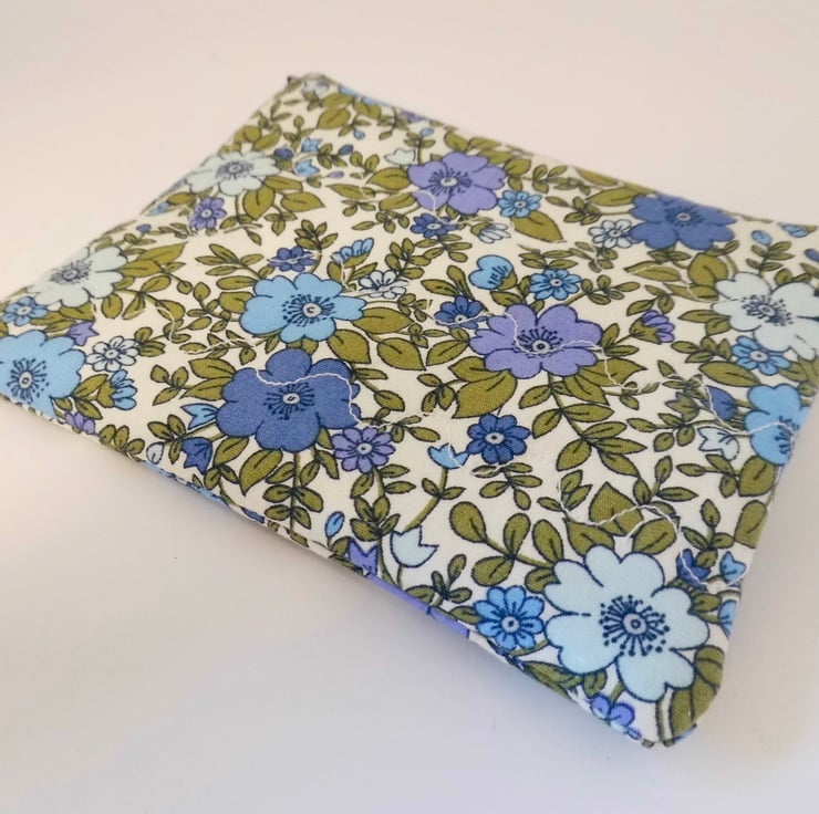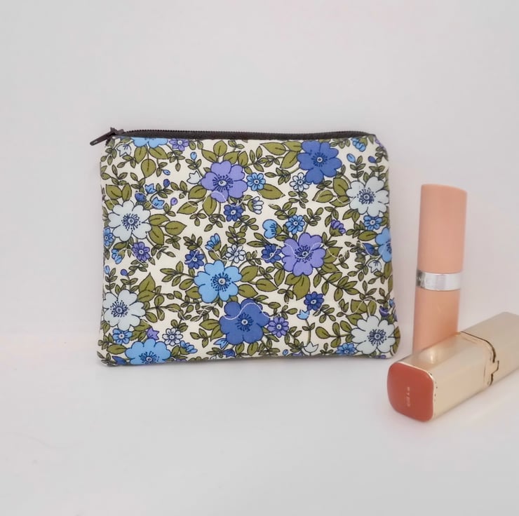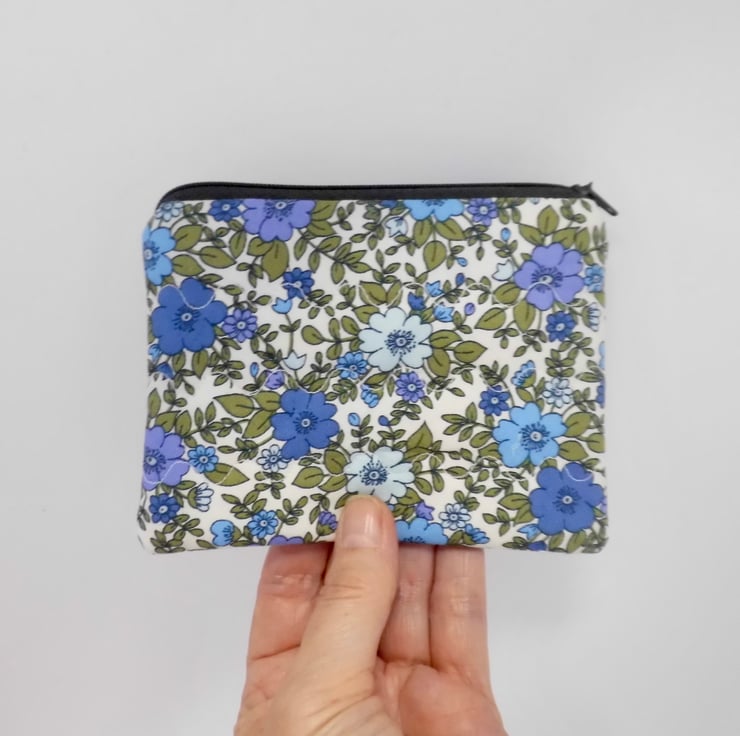 I made this coin purse using a 100% cotton floral fabric by Rose and Hubble in blues and lavender with green leaves. I backed this fabric with fusible quilter's wadding and machine stitched three rows across each side with a wave stitch to achieve a lightly quilted effect.