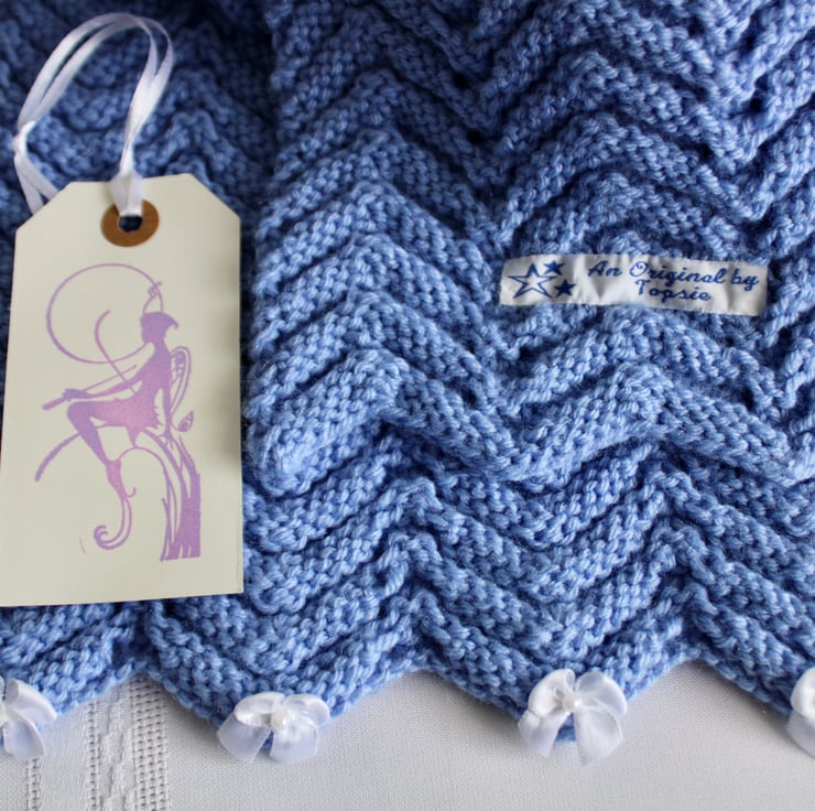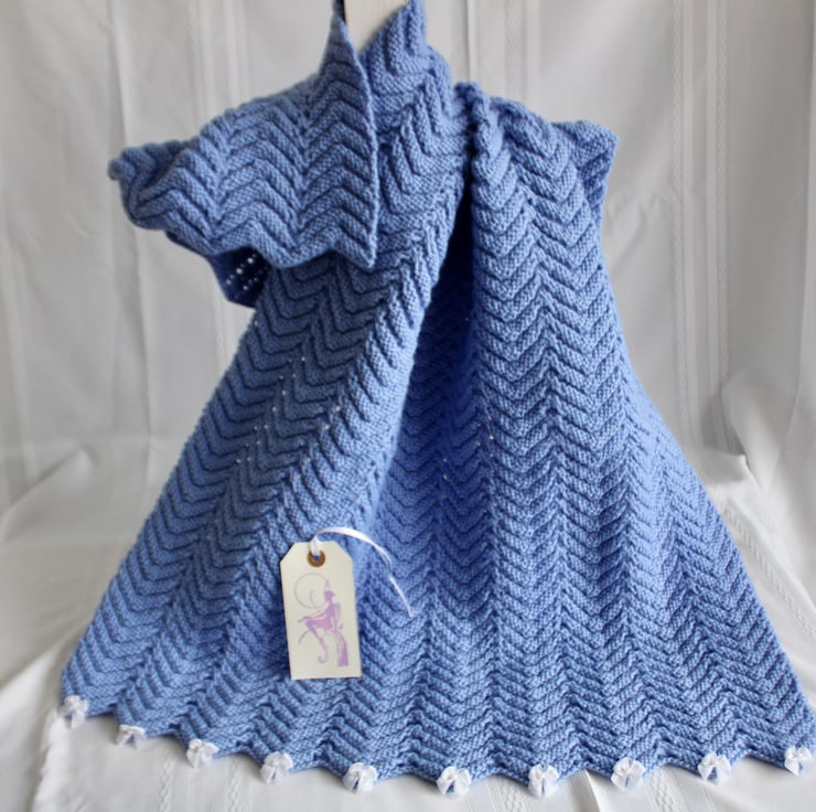 You will keep your baby or toddler really warm with this knitted blanket in a chevron pattern, made from Snuggly Wuggly wool in Cornflower Blue It was hand-made by me and is ideal for a little boy.