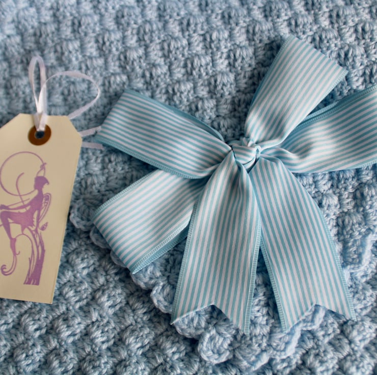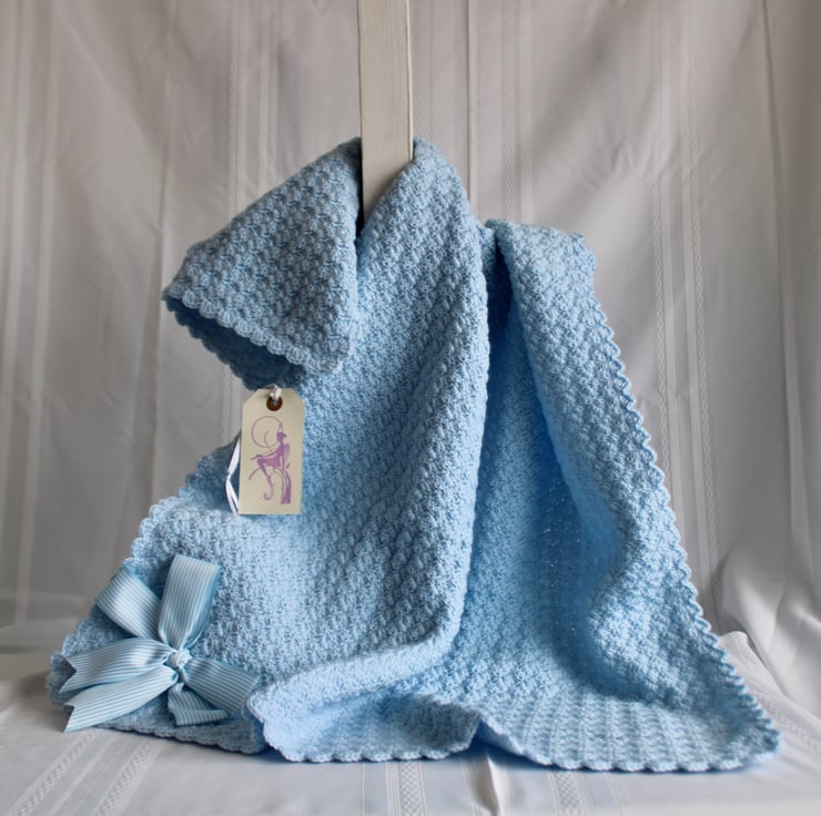 You will keep your baby or toddler really warm with this crochet blanket in a brick pattern, made from Snuggly Wuggly wool in Baby Blue was hand-made by me and is ideal for a little boy.