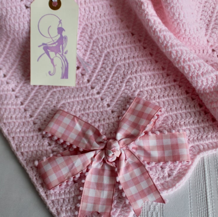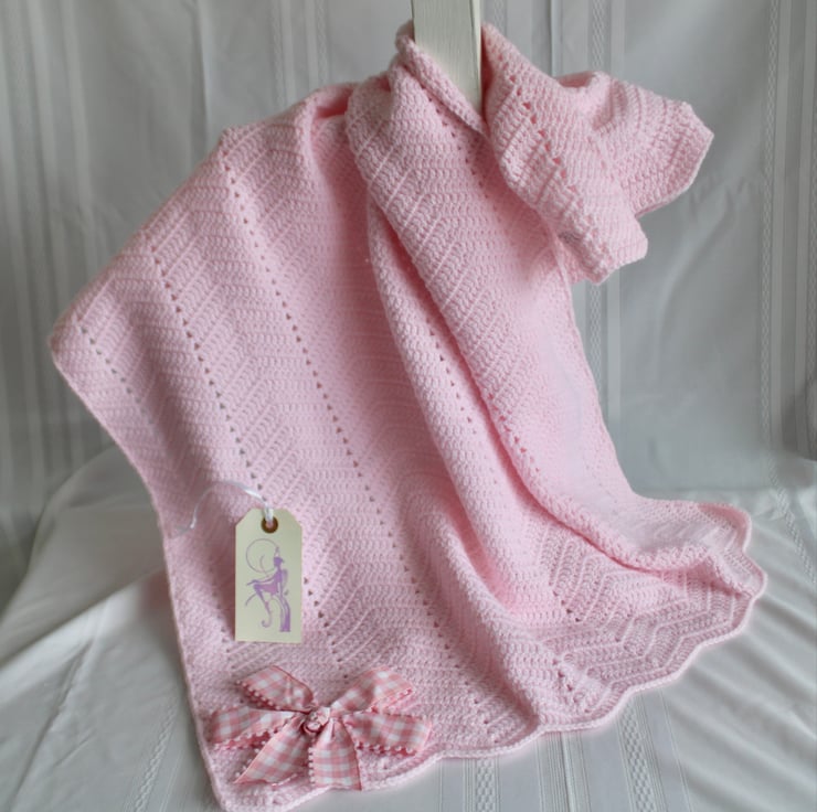 You will keep your baby or toddler really warm with this crochet blanket in a chevron pattern, made from Snuggly Wuggly wool in Baby Pink was hand-made by me and is ideal for a little girl.