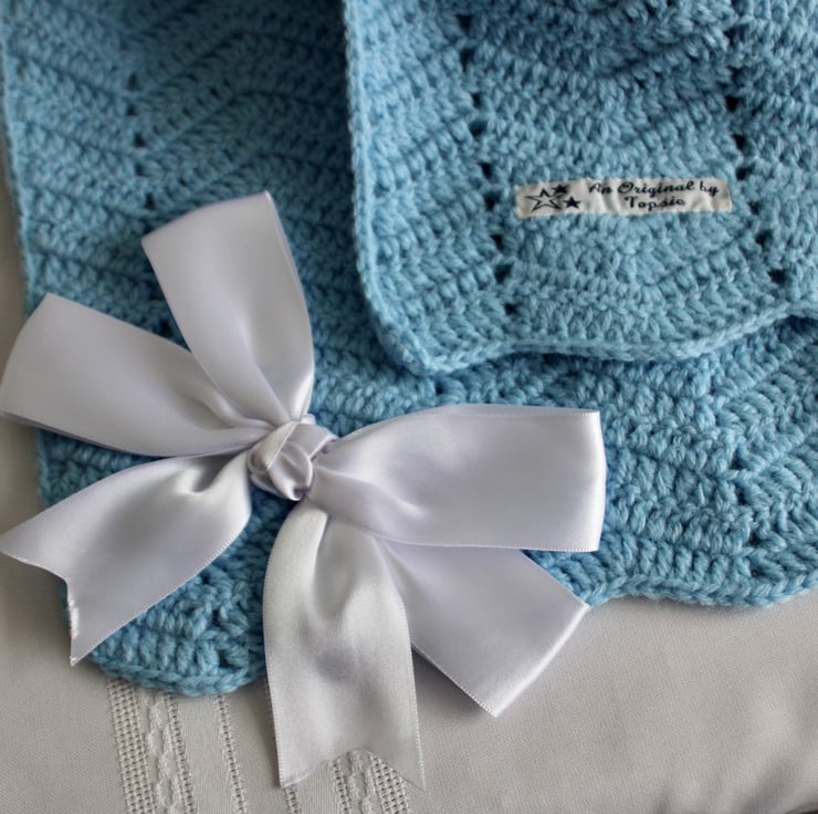 You will keep your baby or toddler really warm with this crochet blanket in a chevron pattern, made from Snuggly Wuggly wool in Mid Blue was hand-made by me and is ideal for a little boy.