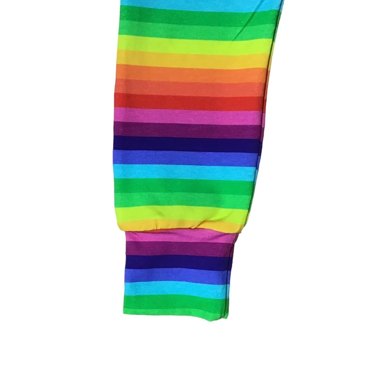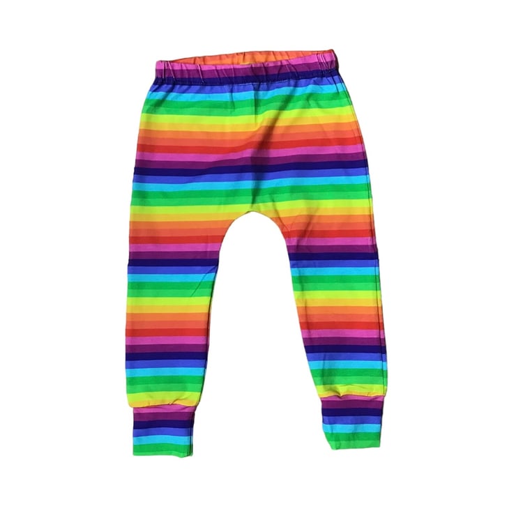 Super soft, Comfy, Cuffed stretchy Cotton (with Lycra) Unisex slim harem style leggings in a bright, fun and colourful rainbow coloured stripe fabric
