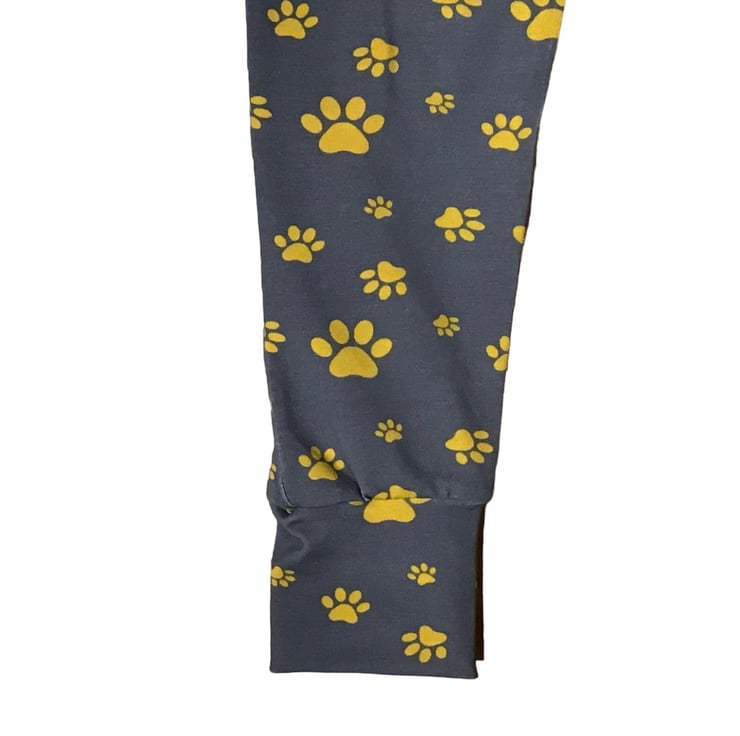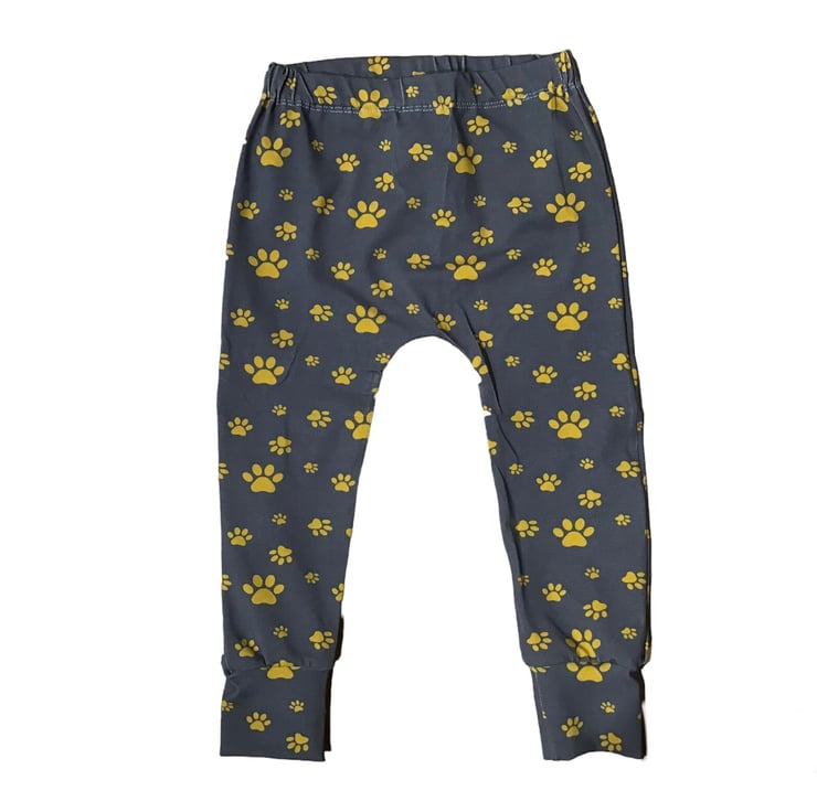 Super soft, Comfy, Cuffed stretchy Cotton (with Lycra) Unisex slim harem style leggings in a Grey fabric with mustard coloured paw prints