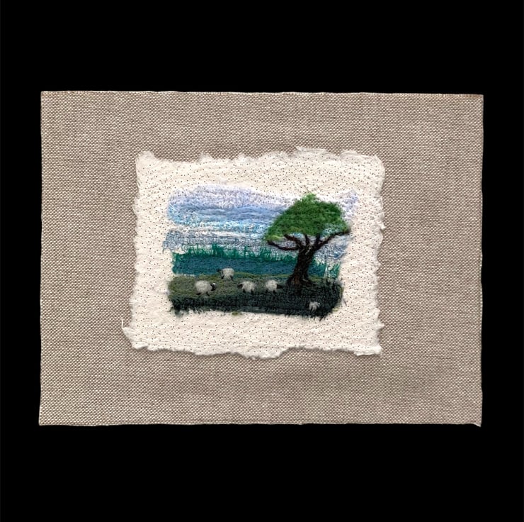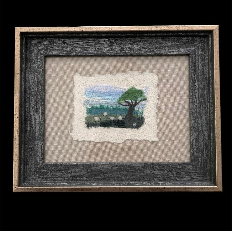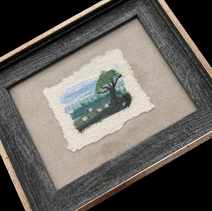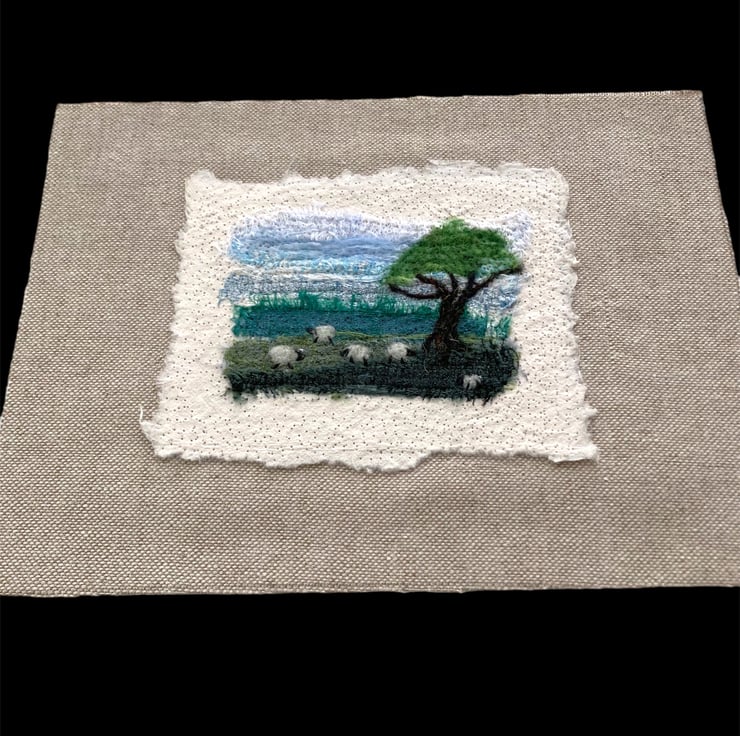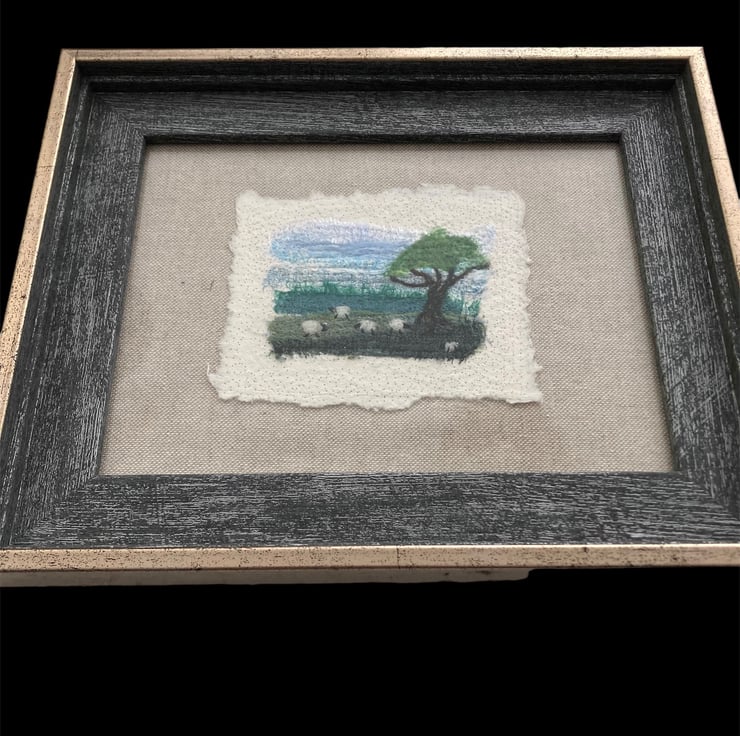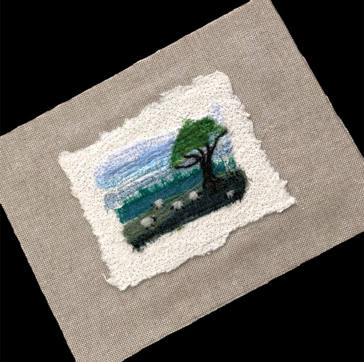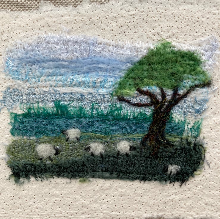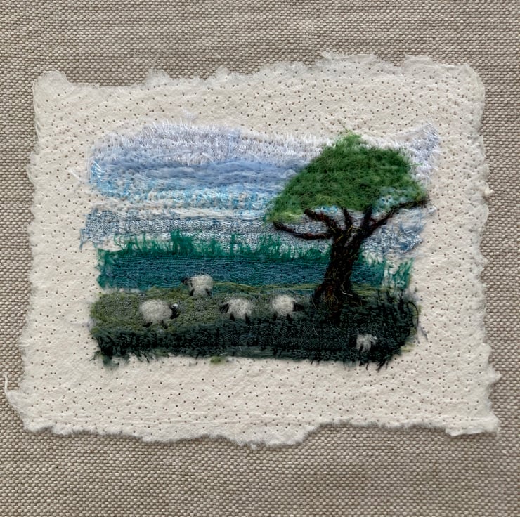 This fabulous little textile art picture has been made by needle felting small strips of silk fabric onto a piece of cotton paper. Woollen fibres have been added in places to blend the colours and create the sheep and tree. The picture has then been needle felted onto a piece of linen fabric and backed with card ready to frame in an 8" x 6" frame. The image on the picture measures approximately 3.5" x 2.5" with the cotton paper measuring approximately 45" x 3.5". The use of needle felting binds the fabrics and paper together without the need for sewing.