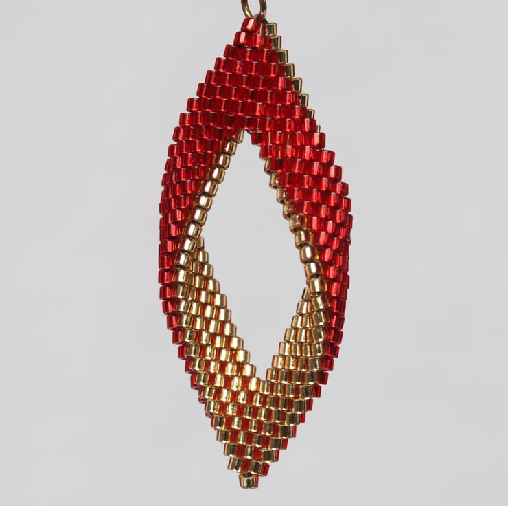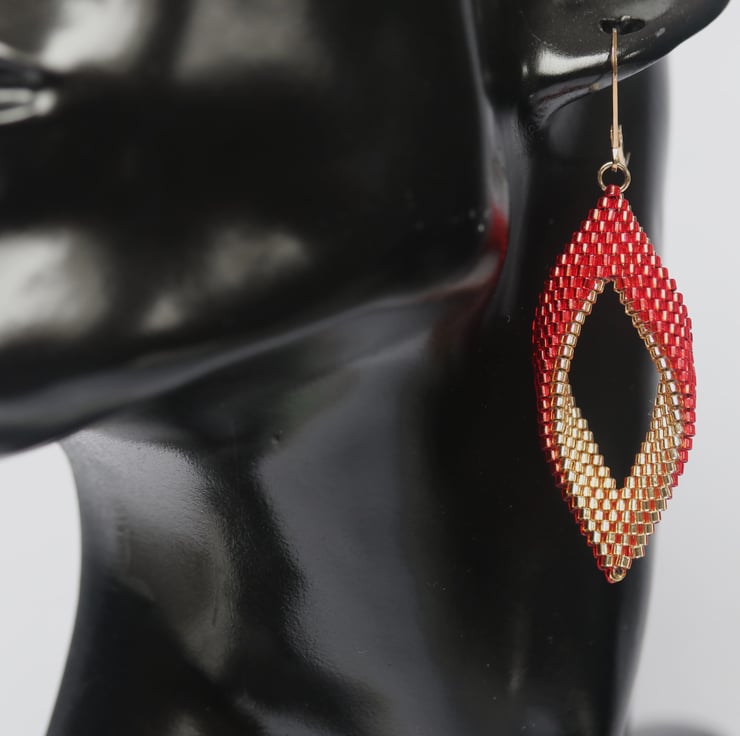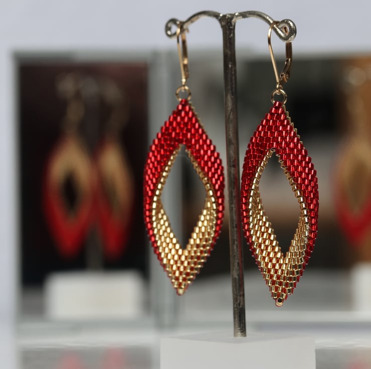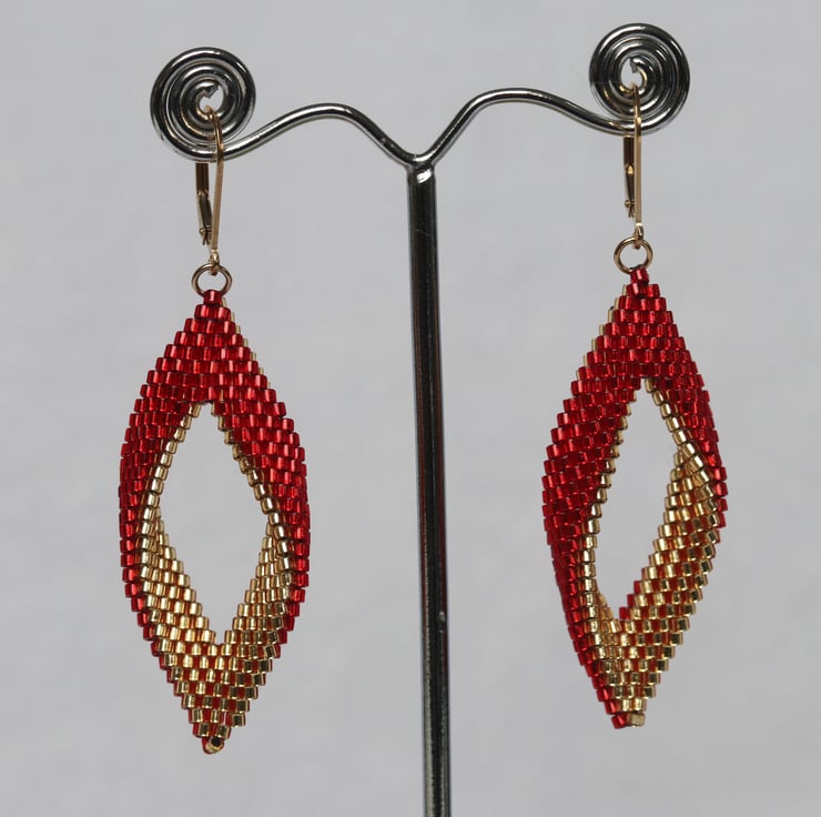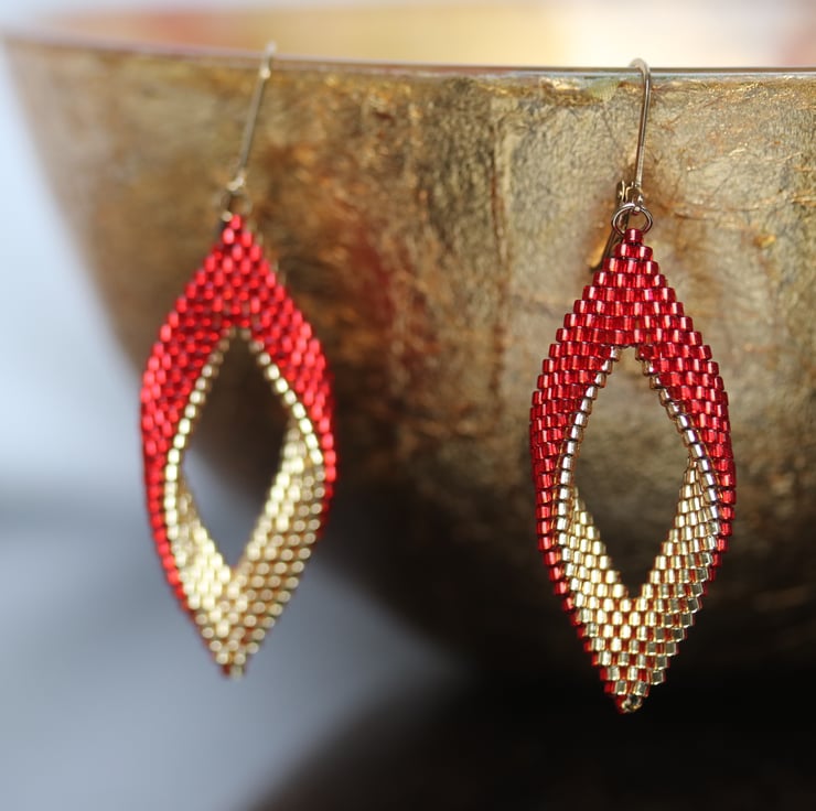 To make these earrings I have used size 11 Miyuki delicas in silver-lined red and in silver-lined gold. They are made by a process called beadweaving, by which the beads are sewn together by strong Fireline beading thread (not unlike fishing line). They are strongly made but as the beads are glass they will break if crushed, so should be kept away from small children and situations where this might happen.