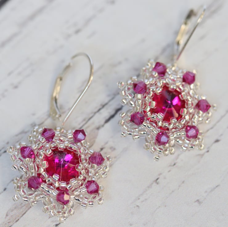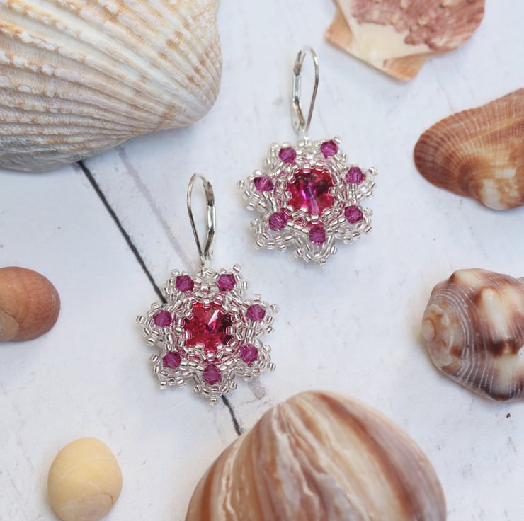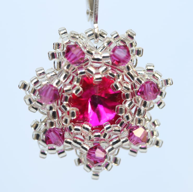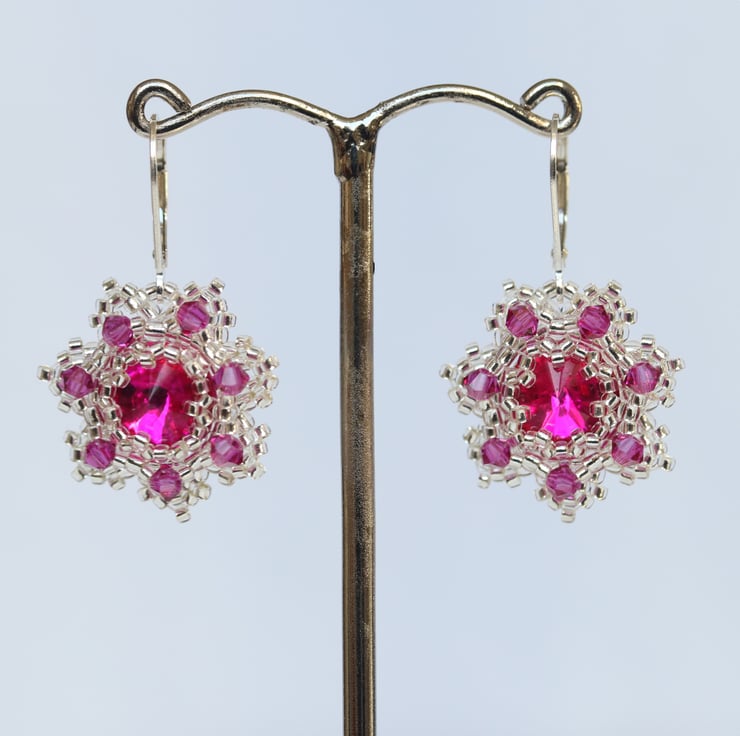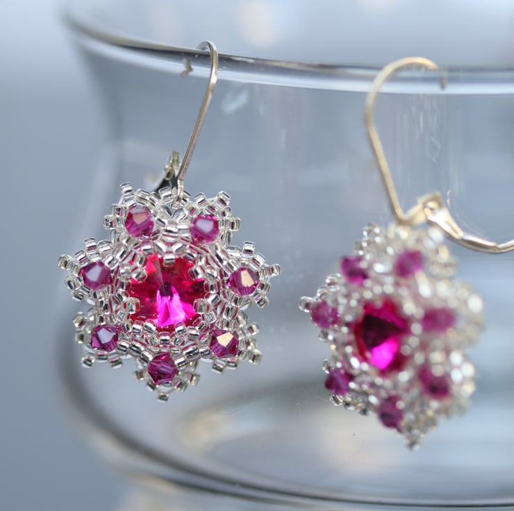 To make these earrings I have used size 11 and 15 Toho seed beads in silver-lined crystal, a 10mm Swarovski Rivoli in Fuchsia and matching 3mm Preciosa bicones. The earrings are made by a process called beadweaving, by which the beads are sewn together by strong Fireline beading thread (not unlike fishing line). They are strongly made but as the beads are glass they will break if crushed, so should be kept away from small children and situations where this might happen.
