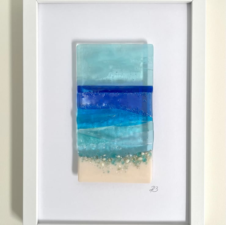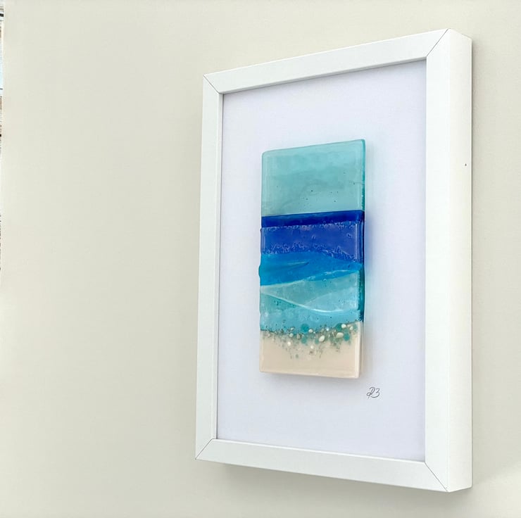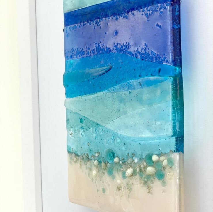 Stunning kiln formed glass seascape picture, created with glass pieces that capture the light and depth of the ocean. Made with a mixed blues and greens, including some iridescent glass. The glass has texture and captures the light beautifully.