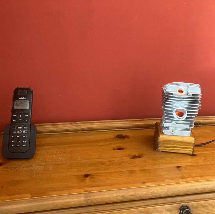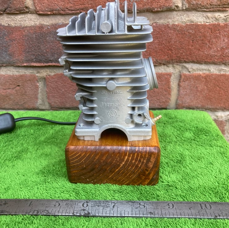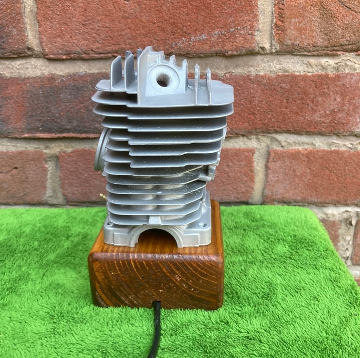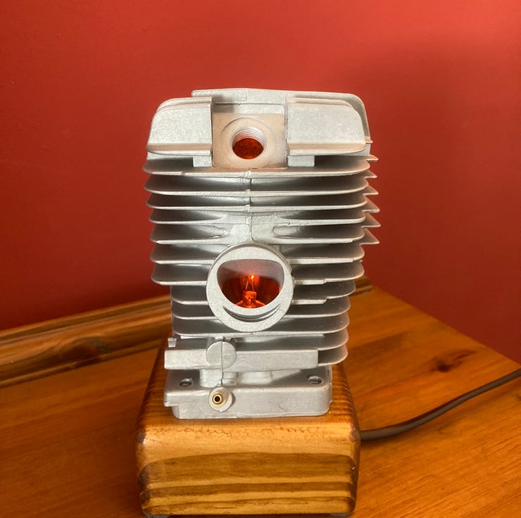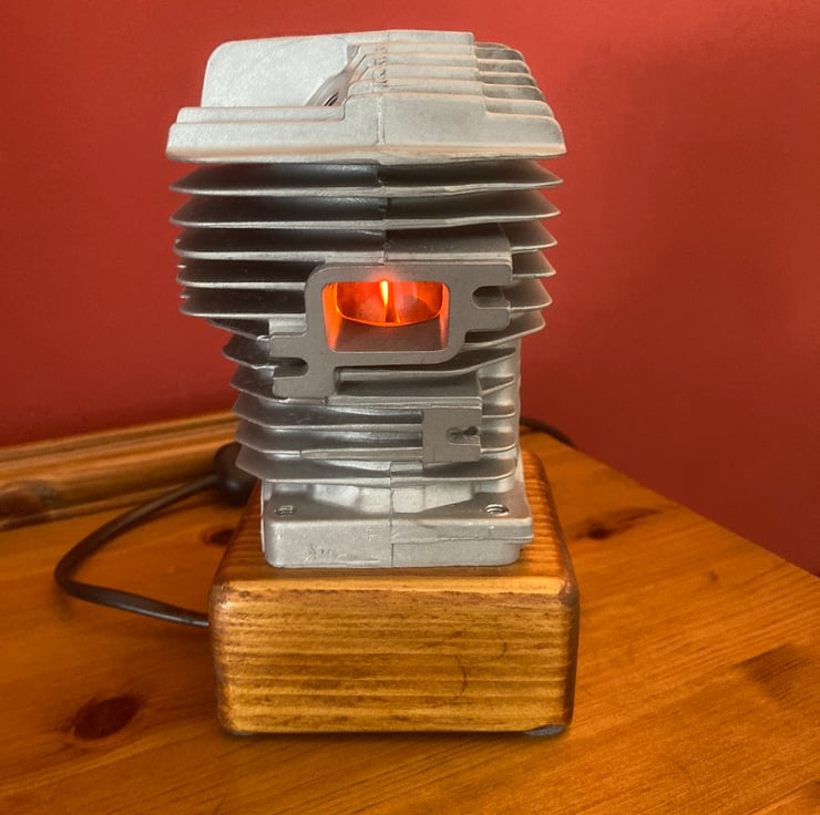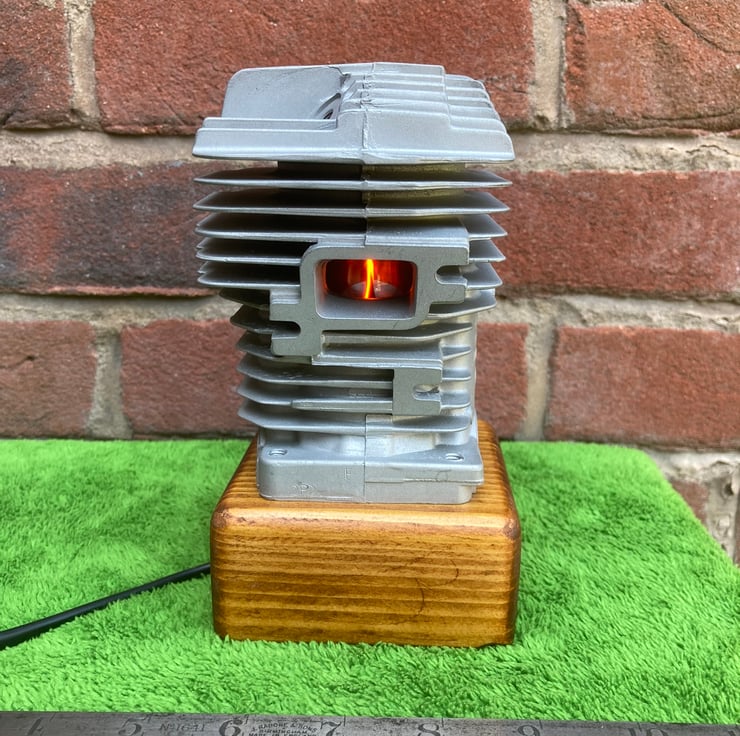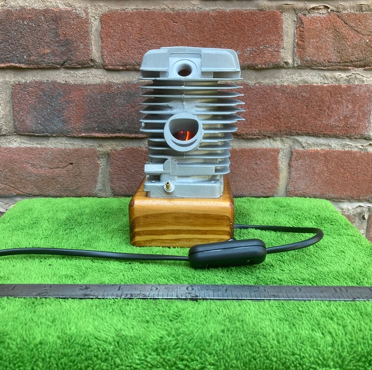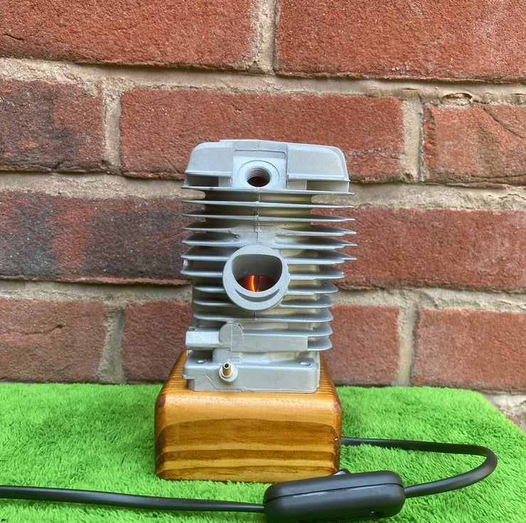 A used chainsaw engine cylinder, from a well-known and respected German manufacturer, mounted onto a reclaimed wood base. The cylinder, from a commercial grade chainsaw, has been thoroughly cleaned and degreased before being mounted onto a (sanded and French polished) salvaged wood base. I have fitted a black resin SES lampholder into the wooden base to hold a 3-Watt LED flame effect candle bulb inside the cylinder; the flickering red-orange light reflects beautifully from the polished bore of the cylinder and out through the ports. Two metres of new, unobtrusive, black flex fitted with black inline switch and 3-amp fused plug complete the lamp. A unique and decorative lamp that would create interest and atmosphere anywhere.