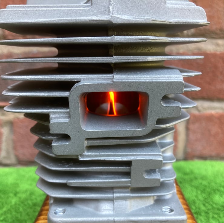 I decided to try putting a flame effect bulb inside a chainsaw cylinder to see how it looked and I am very pleased with the result! It gives a really subtle low-level effect that draws you in to look closer.