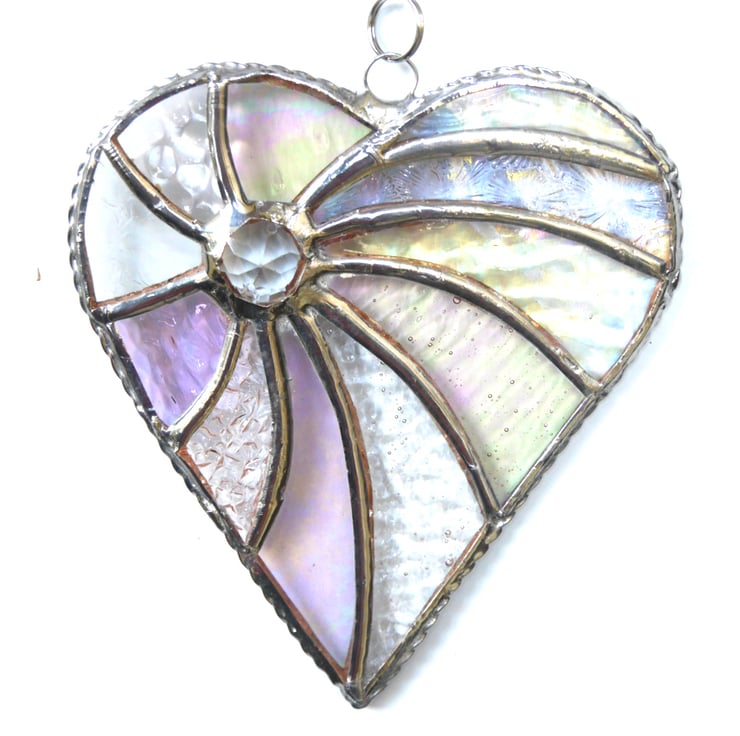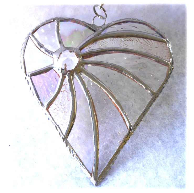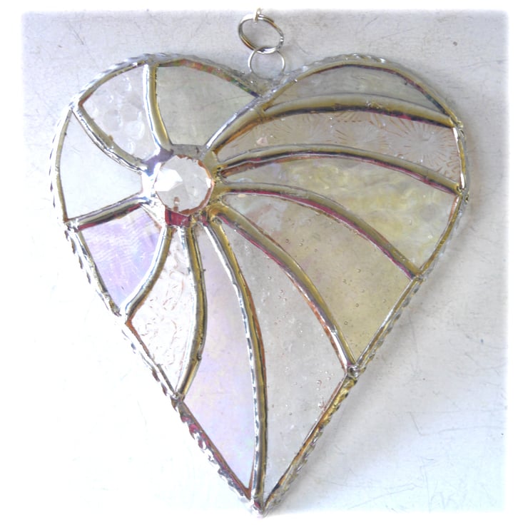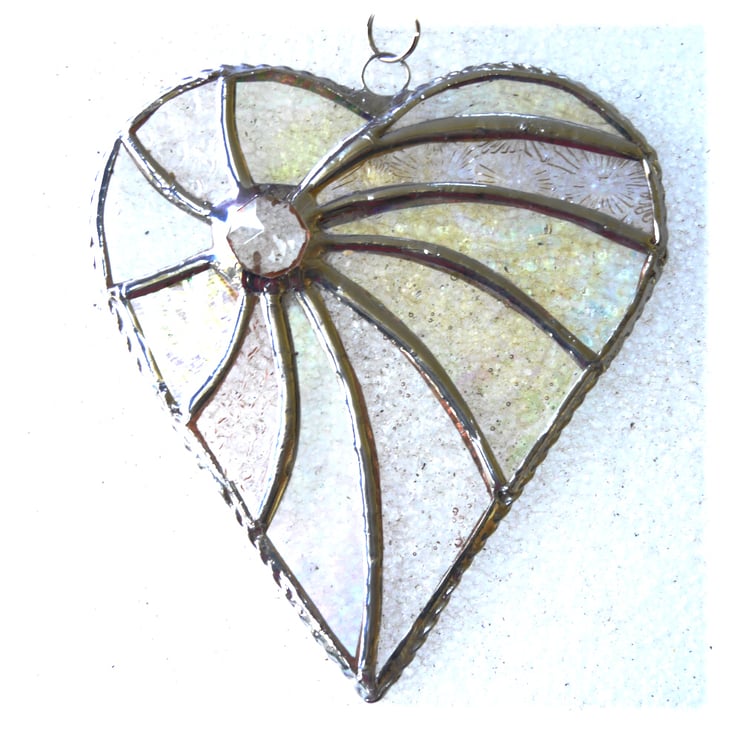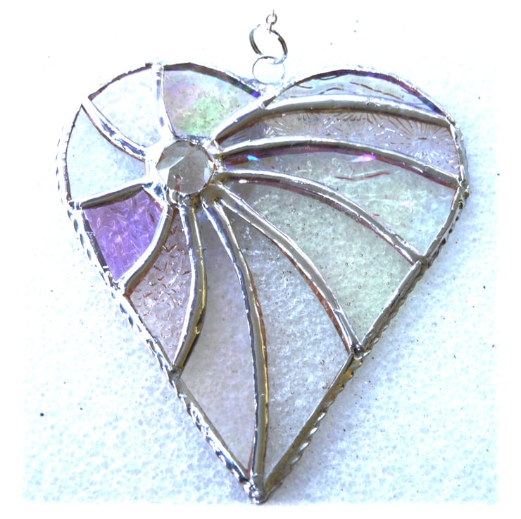 I've made the heart from all different types and shades of clear sparkling glass swirling out from a lovely shiny crystal. A lot of the glass is iridescent so shimmers in shades of pink purple and turquoise and there is a lot of movement in the heart as I've used different textures.