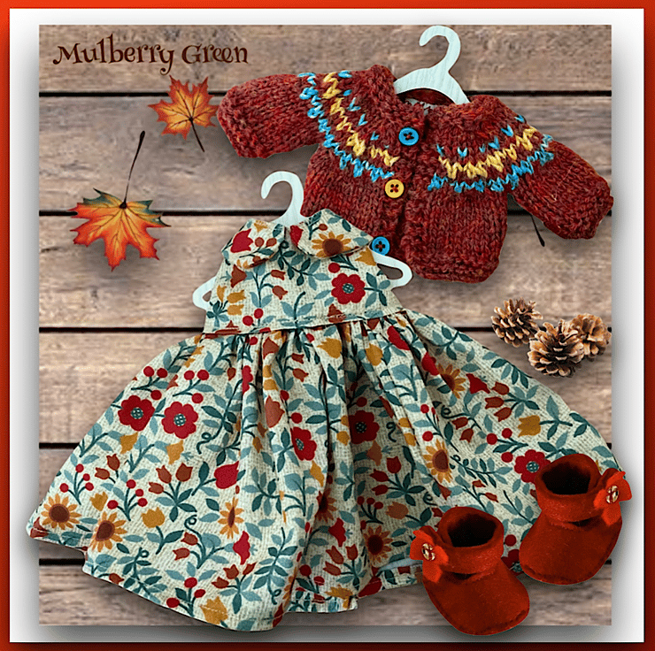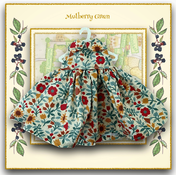 A really lovely little dress in a folk art fabric to fit the Mulberry Green characters. The dress is made from best quality cotton and has a full skirt and a lined bodice.