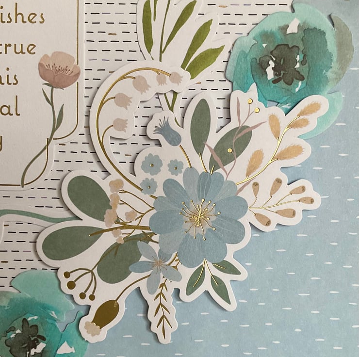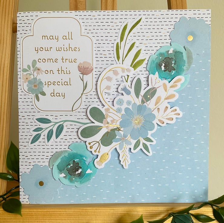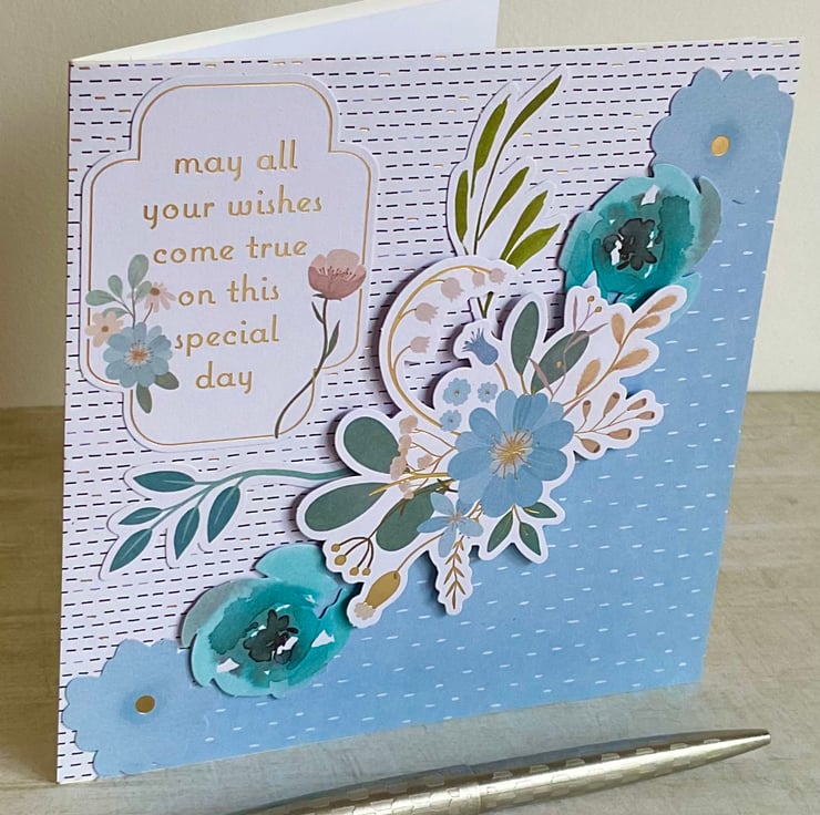 The card features a die cut floral arrangement in shades of blues and green which have been applied in 3D adding depth and interest to the card.
