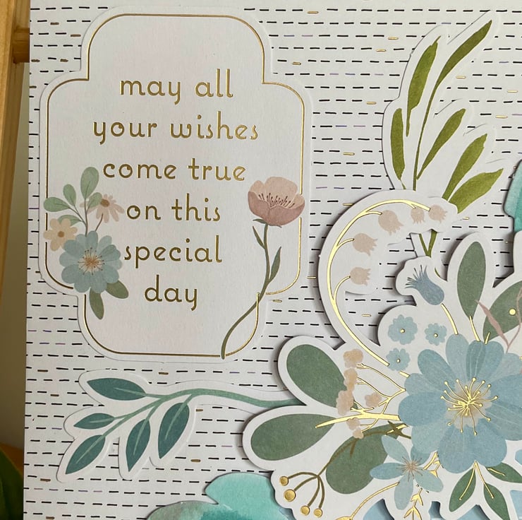 The card is embellished with the words may all your wishes come true on this special day, making it perfect for any special occasion.