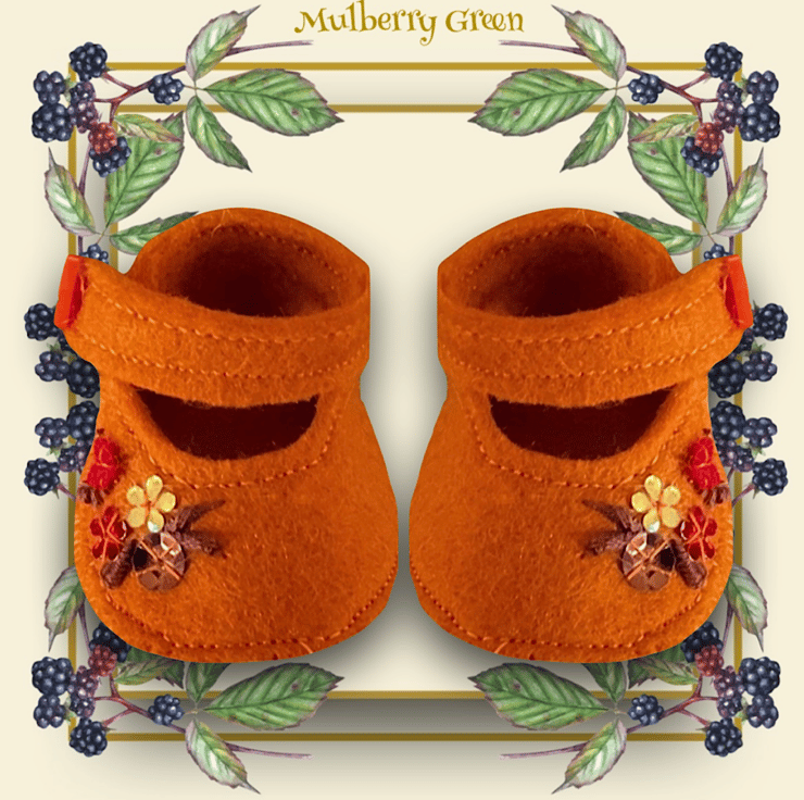 A pretty little pair of orange shoes, embroidered with flowers, to fit the Mulberry Green characters. The shoes look lovely with the pretty dresses in my shop.
