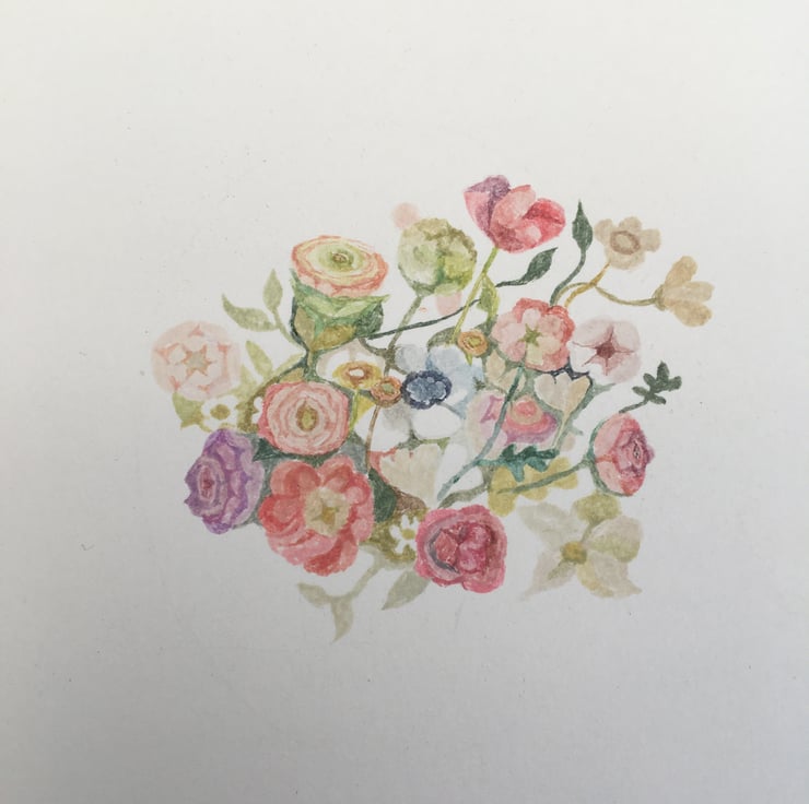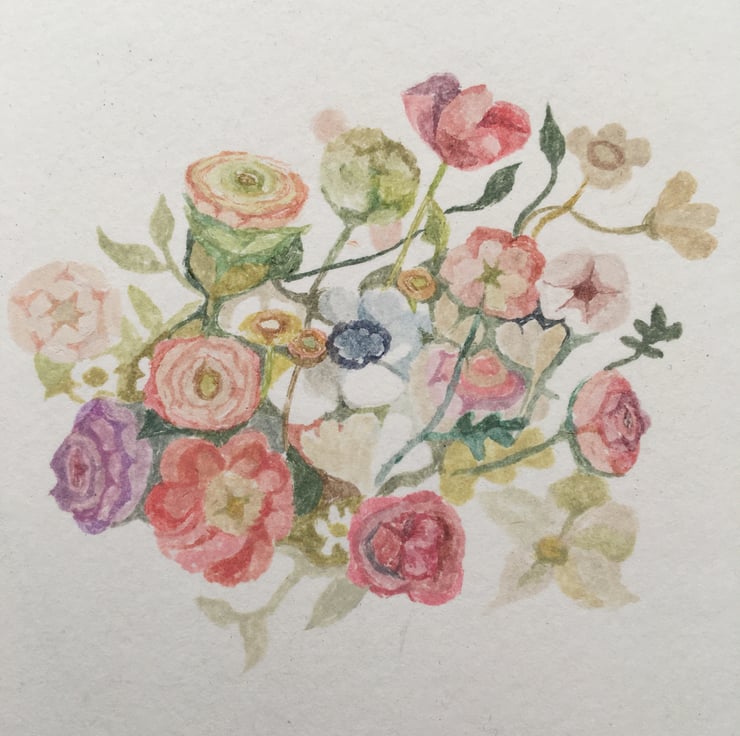 An original gouache painting on cold pressed acid free 300gsm artists watercolour paper measuring 12.5cm by 12.5cm. The image measures 7.5cm by 6cm. The painting consists of flowers made from my imagination and would make an ideal gift. The painting will be sent inside a board back envelope.