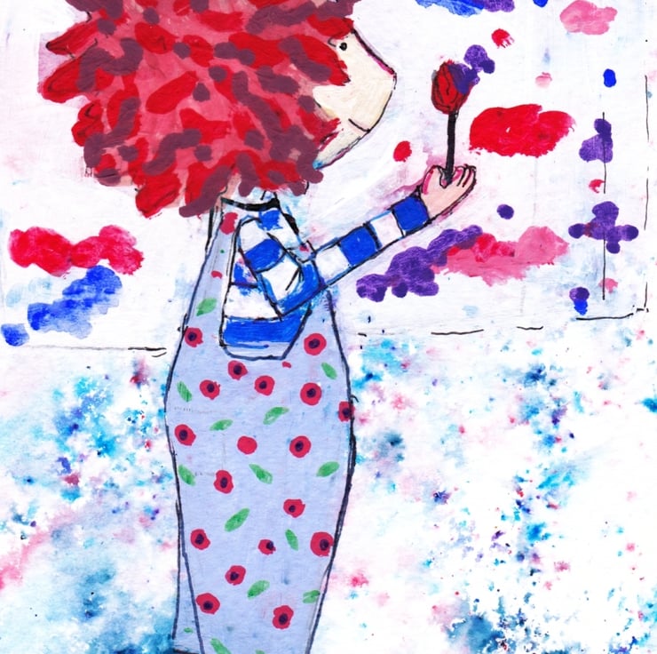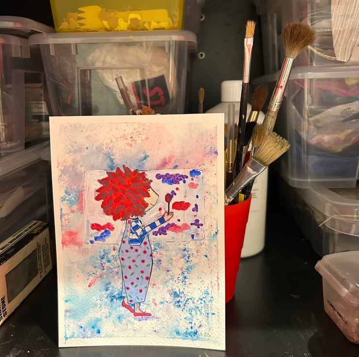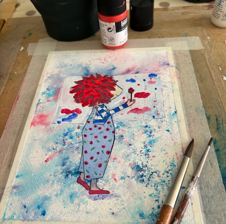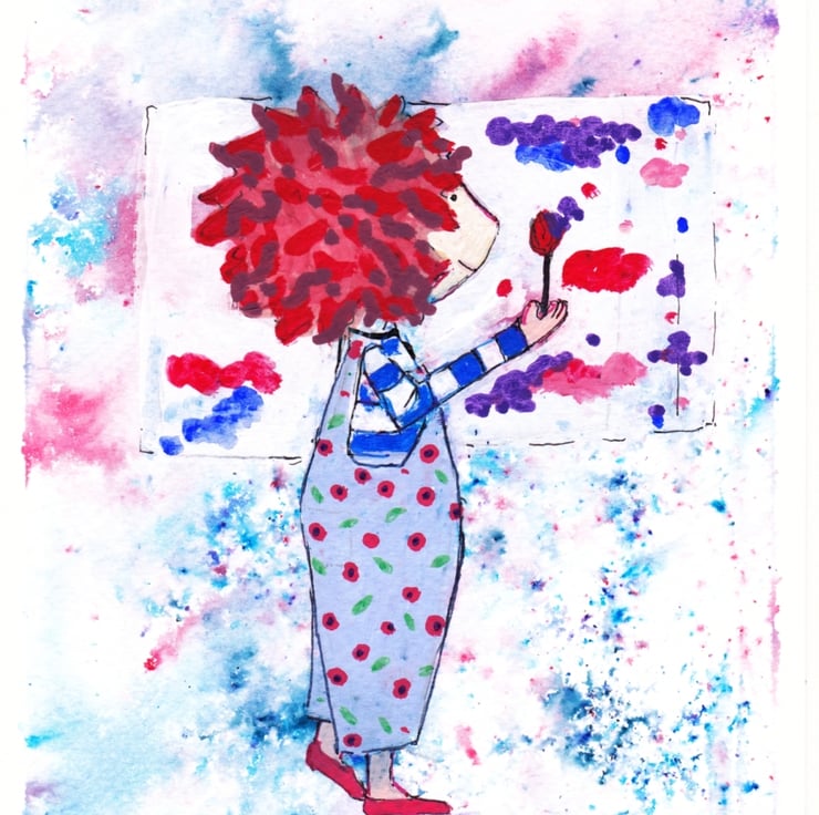 A quirky little painting of a artist. The starting point or this is artwork is using Brusho powder which when sprinkled onto paper and then sprayed with water it makes a lovely abstract pattern.
