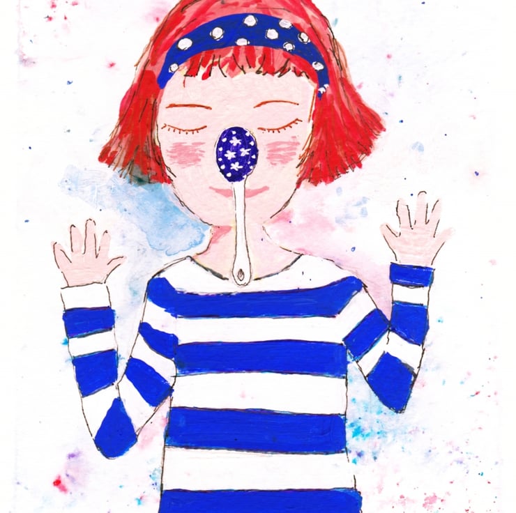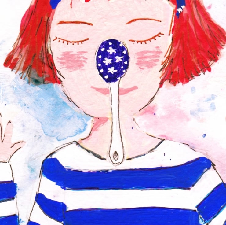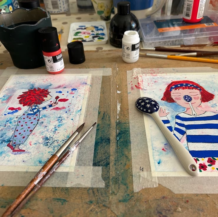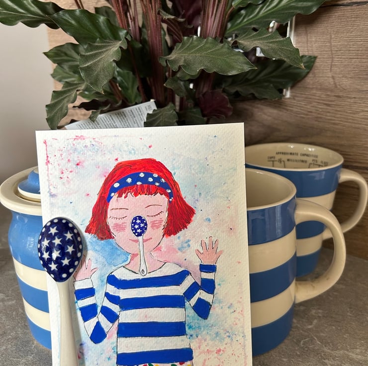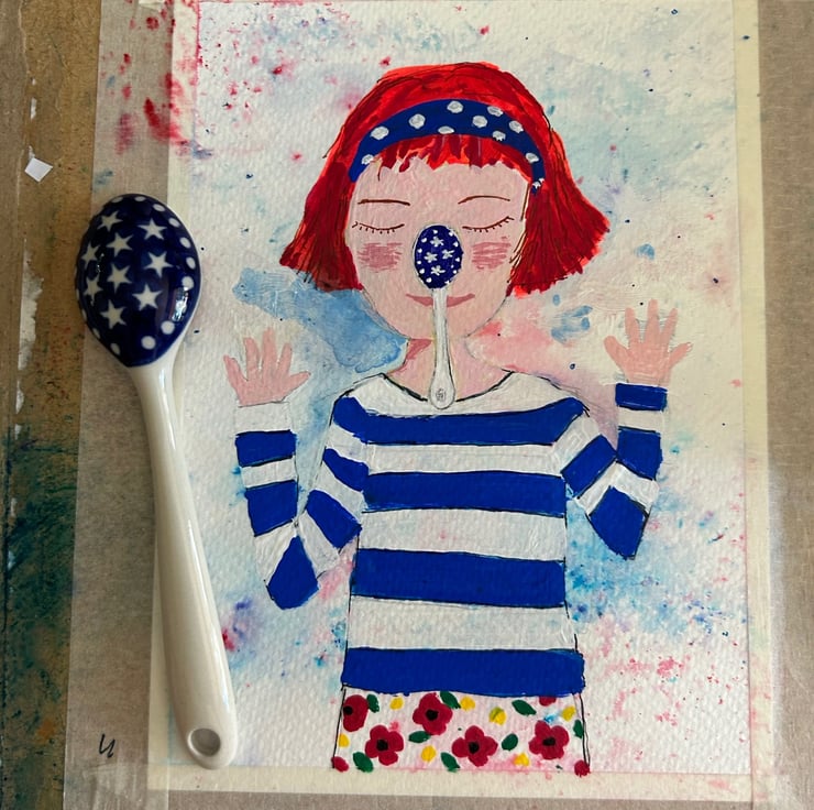 The inspiration for this little painting is Cornishware pottery and a little pottery spoon that I own. I love to collect blue and white pottery and often use it as a starting point for ideas.