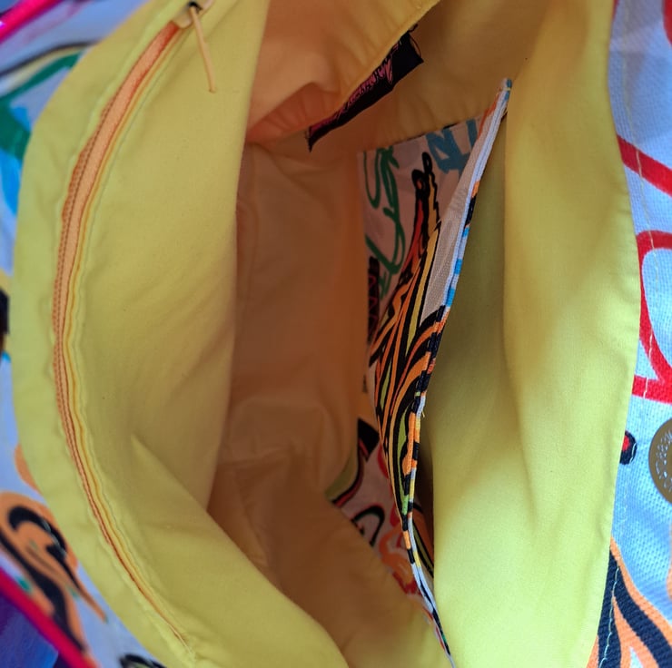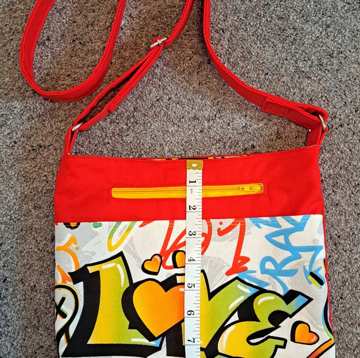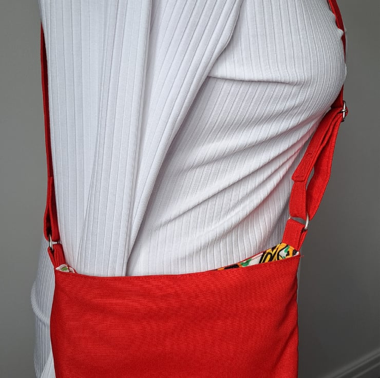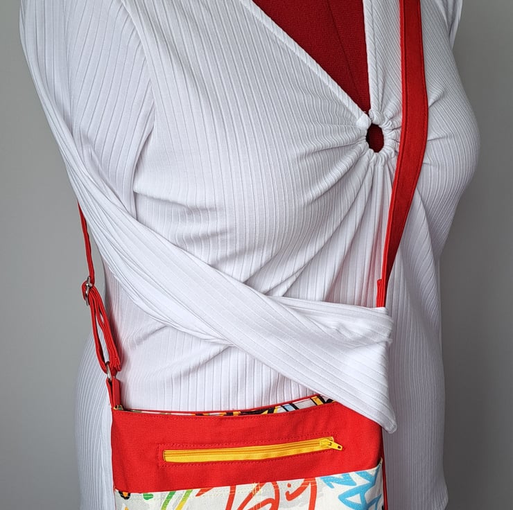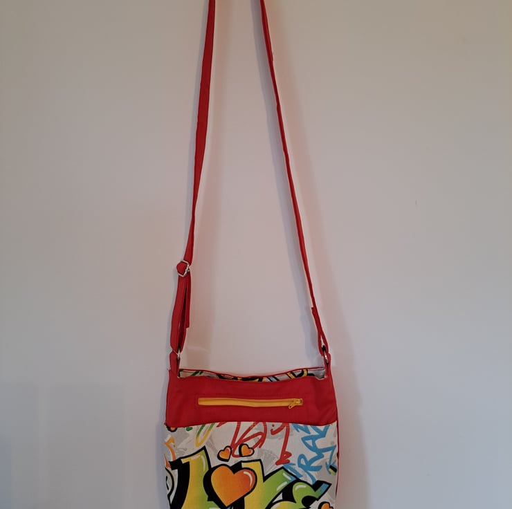 Funky Cross Body bag made from red canvas with a funky canvas print outer split slip pocket with matching internal slip pocket and facings. Also has a zip pocket on the font and one inside. Strap is fully adjustable with a max length of 23" (approx) and and min length of 12.5" (approx). My 8 year old granddaughter loved this bag. Think it would be suitable for early teens too.