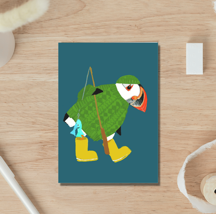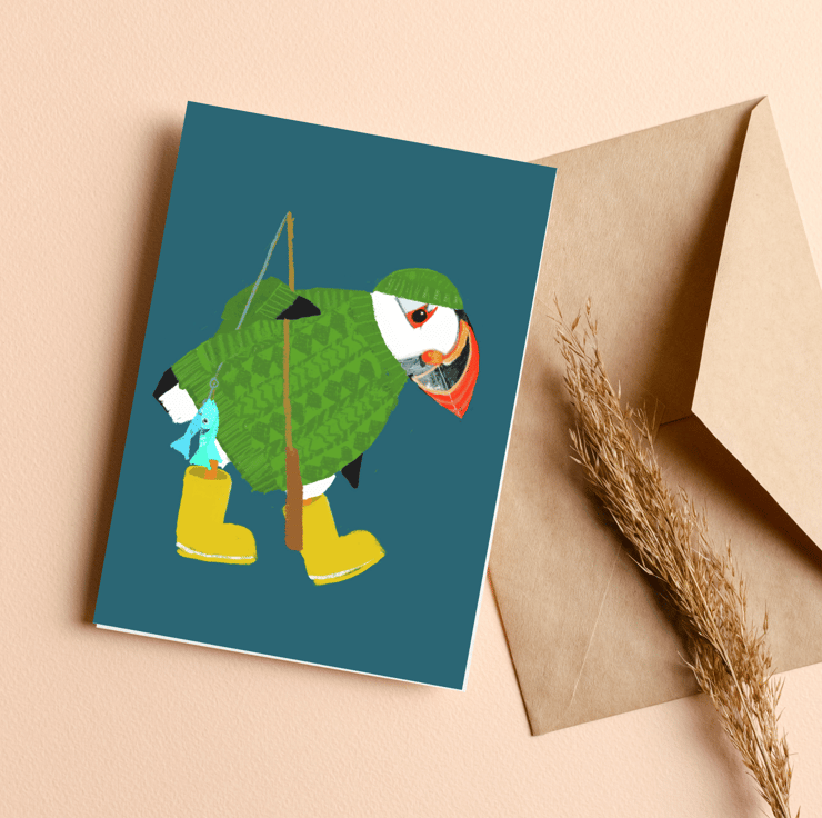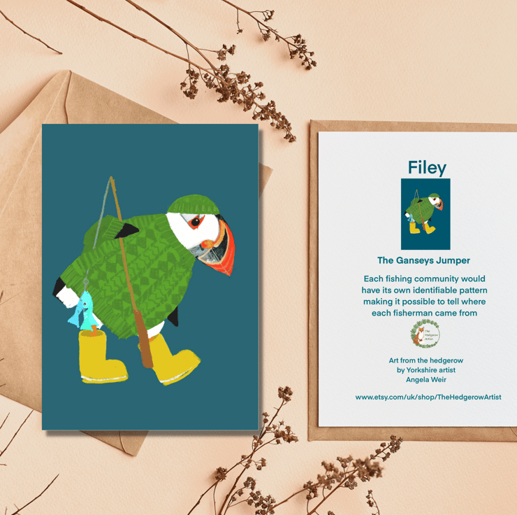 There are 5 designs available - Puffins wearing jumpers from different fishing communities along the yorkshire coast. Includes Scarborough, Whitby, Robin Hoods Bay, Filey and Whitby. Each puffin has its own unique design for the town that it comes from. On the back of each card it says the name of the town and explains a little more about the Gansey jumper.