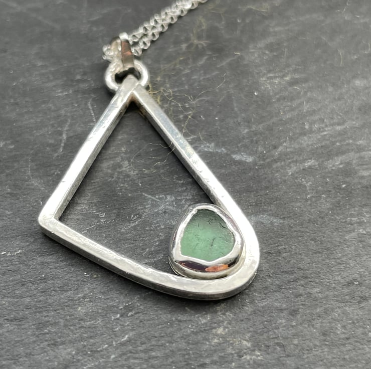 A beautiful piece of organically shaped sea glass collected from our local beach has been hand set in a fine silver bezel with a sterling silver back.