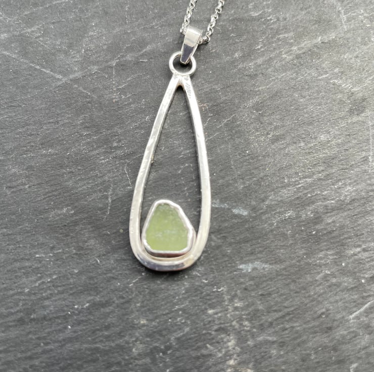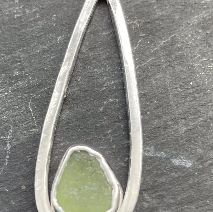 A beautiful piece of organically shaped sea glass collected from our local beach has been hand set in a fine silver bezel with a sterling silver back.