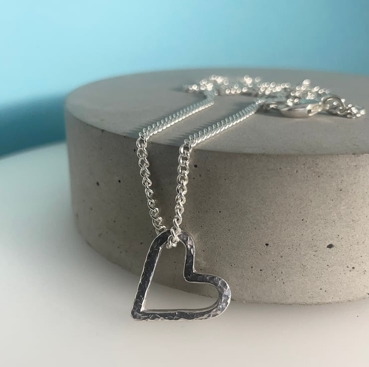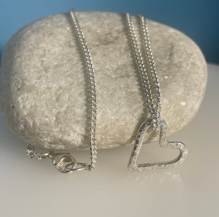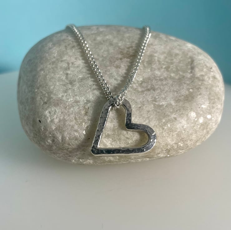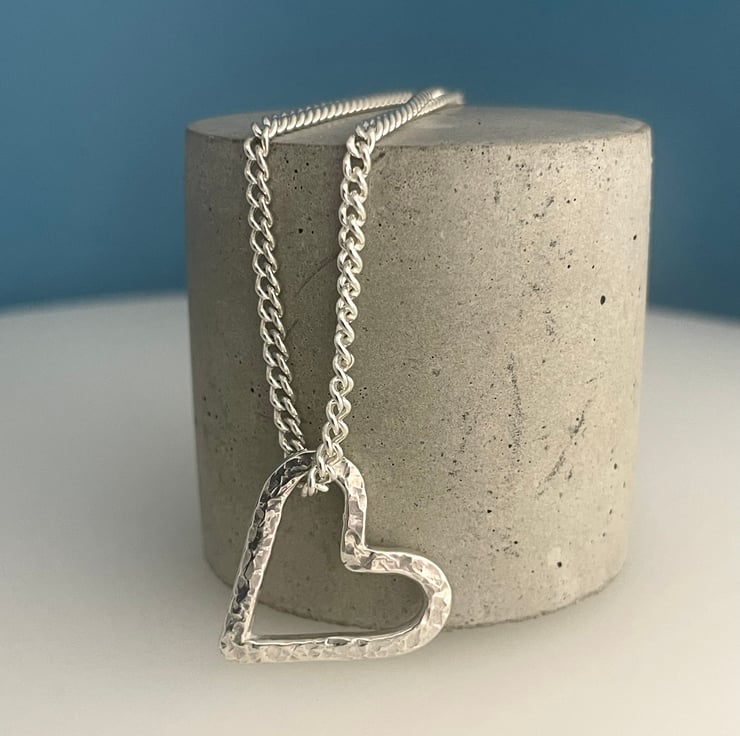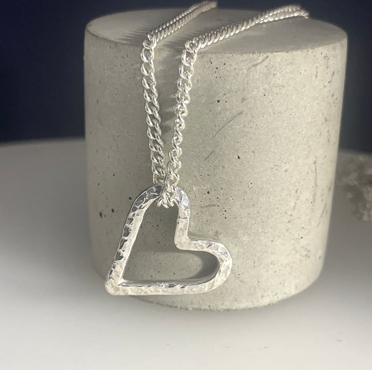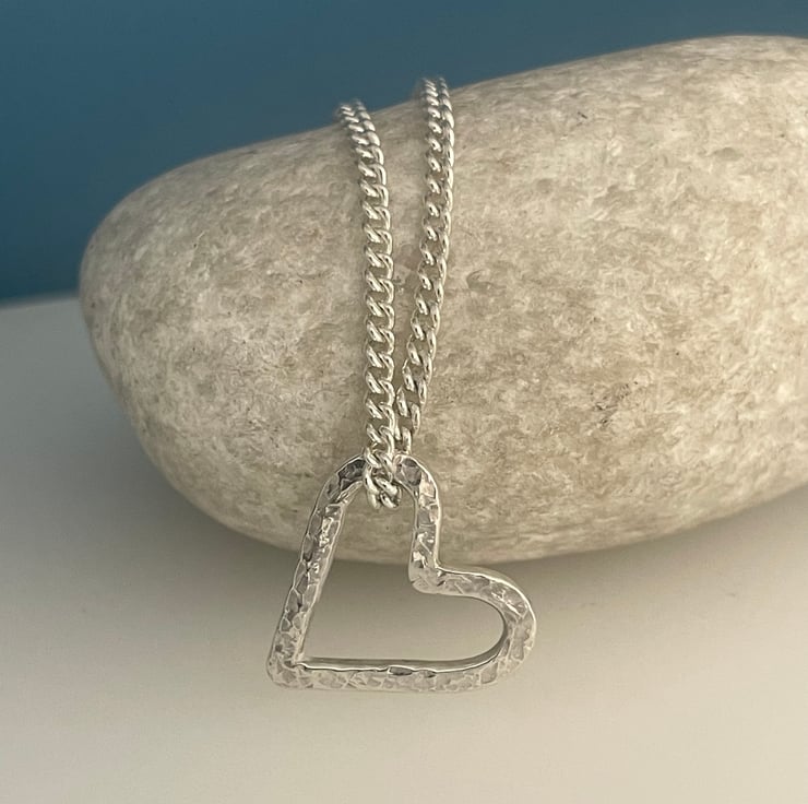 A lovely heart pendant necklace handmade from 925 sterling silver. Cut by hand from solid silver wire, formed into a heart then hammered to create a an attractive sparkly textured surface. Hung onto a lovely silver curb chain along with a silver trigger clasp as it's fastening.