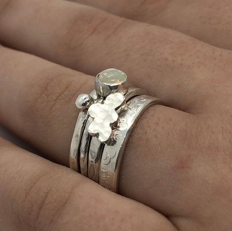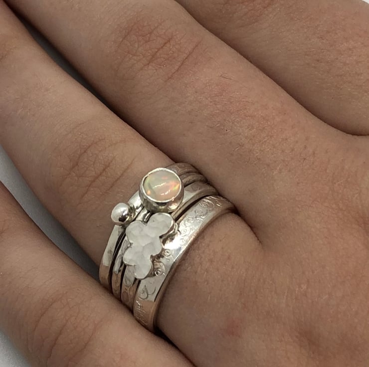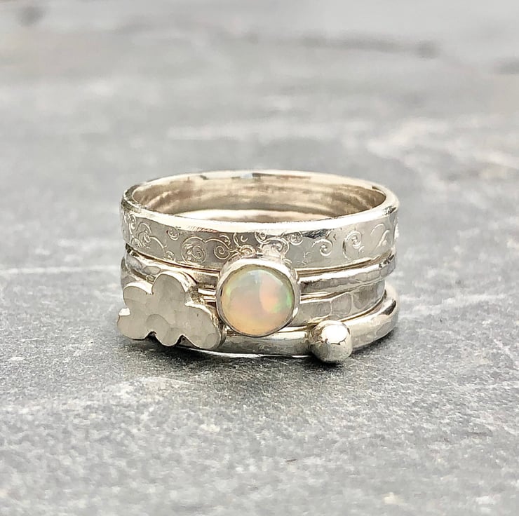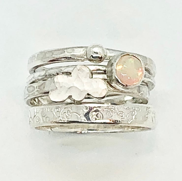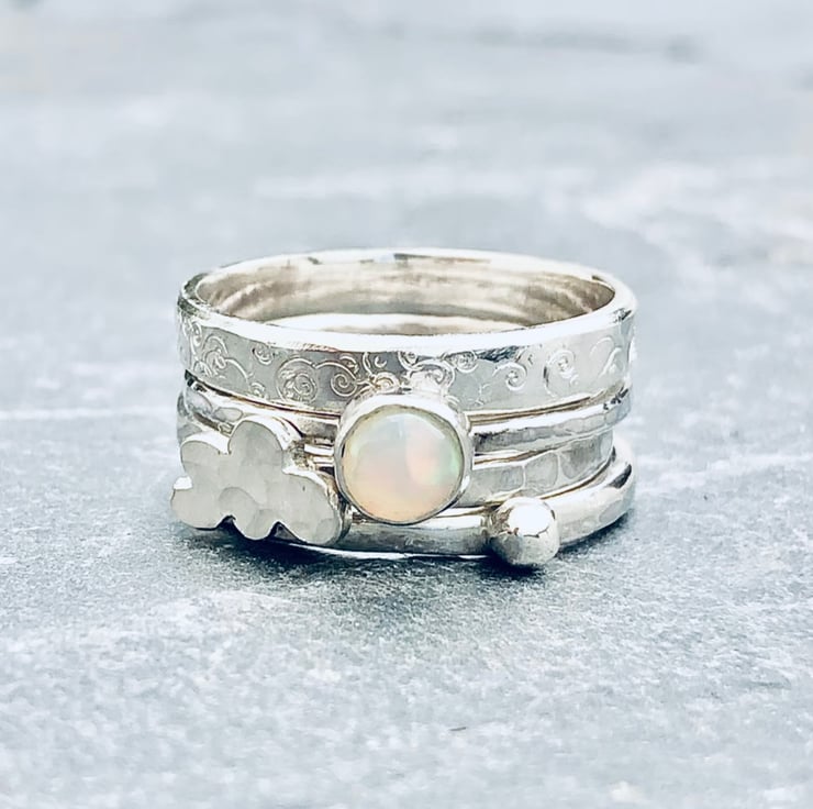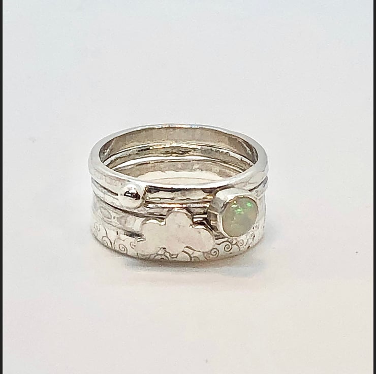 This silver stack ring is made from Sterling silver and features four textured rings. The first is a 5mm Opal, the second has a silver, hammered cloud, the third ring is a flat 2.5mm wide, cloud stamped, band and the last ring has a silver ‘rain drop’ detail. In total the ring measures approx: 7mm in width. The cloud ring in the photo has a matt finish but if you want a shiny cloud, let me know.