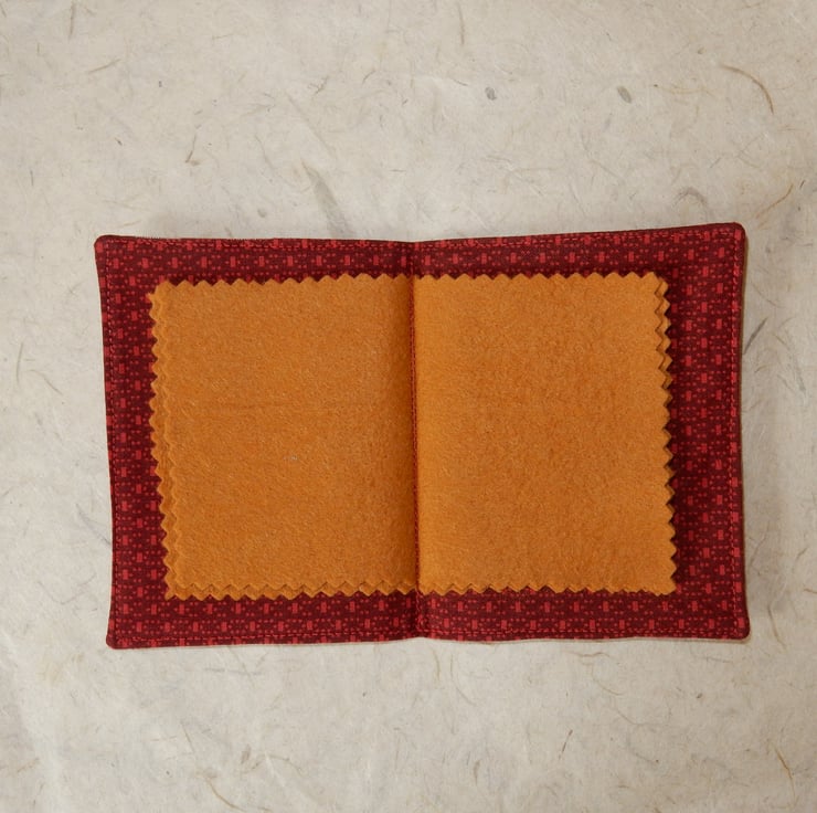 These stylised cats are appliqued on this needle case, made of red and cream gingham fabric. There is a purple and blue cat on the front and an orange and purple cat on the reverse. It measures approx. 4.5 x 3 inches , and it is lined in toning cotton fabric and has four felt leaves for your pins and needles.