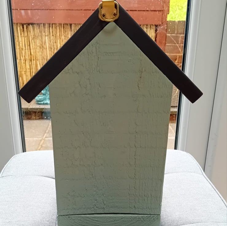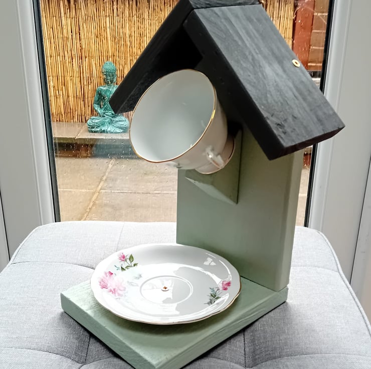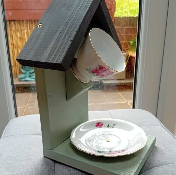 Wooden bird feeder with china cup and saucer, Grey roof and heritage green back and bottom.