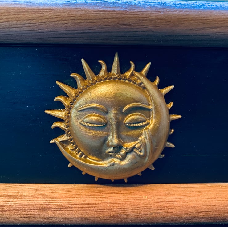 This is built from solid timber and handpainted in an antiqued midnight blue with luxuriously gold coloured 3D celestial embellishments.
