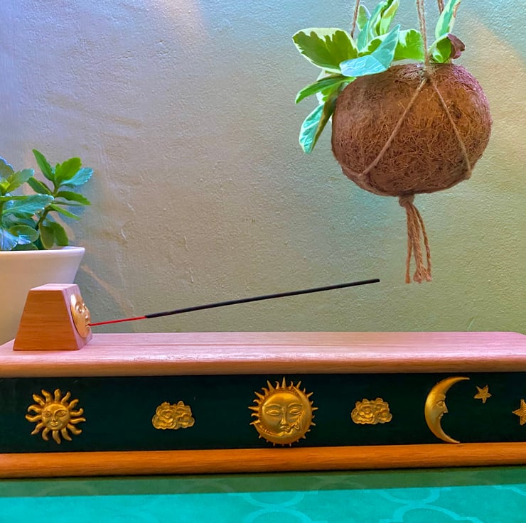 We wanted to make an incense holder that was not only practical, but looked magical too. The luxurious gold celestial embellishments stand out against the antique blue in such a beautiful way! The ash from the incense is caught on the top of the burner which is easily wipeable. Simply lift the lid to reveal a storage unit for your incense sticks.