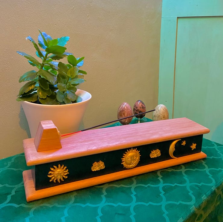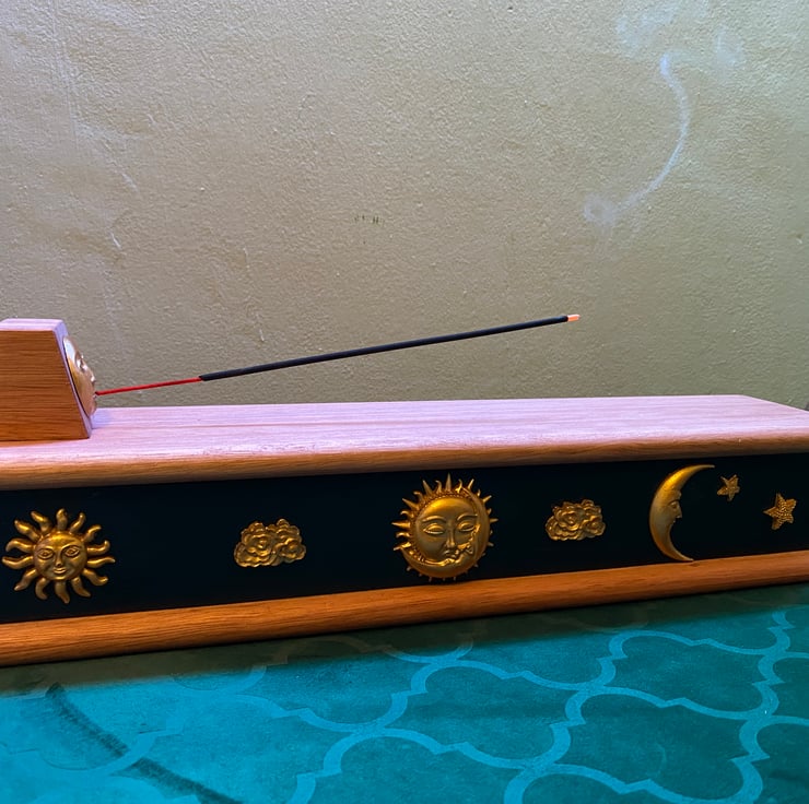 This is such a mystical way to burn your incense! Simply pop your incense stick in the mouth of the golden sun embellishment and the ash will fall onto the wooden top. This easily wipes away and stops any mess from the ash of your incense! Lift the lid of the incense burner to reveal a clever storage box to house your incense.