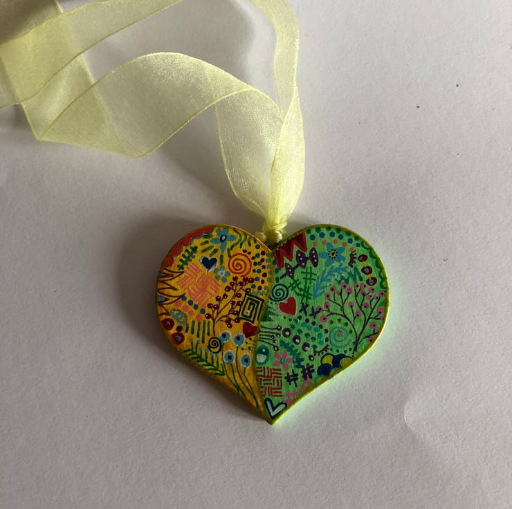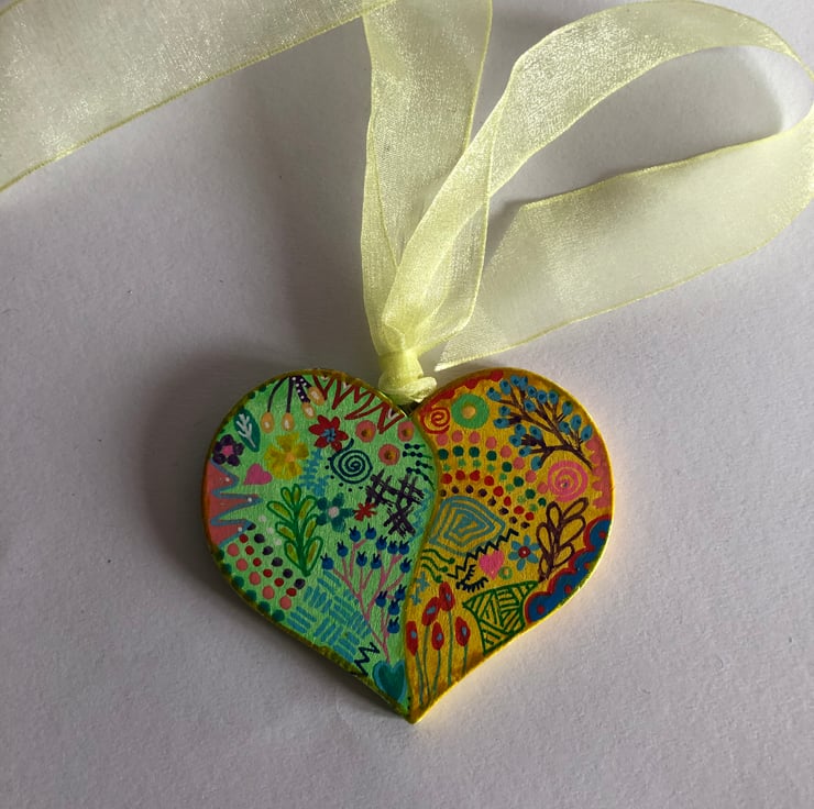 Both sides of this wooden heart have been hand painted in a variety of colours and varnished.